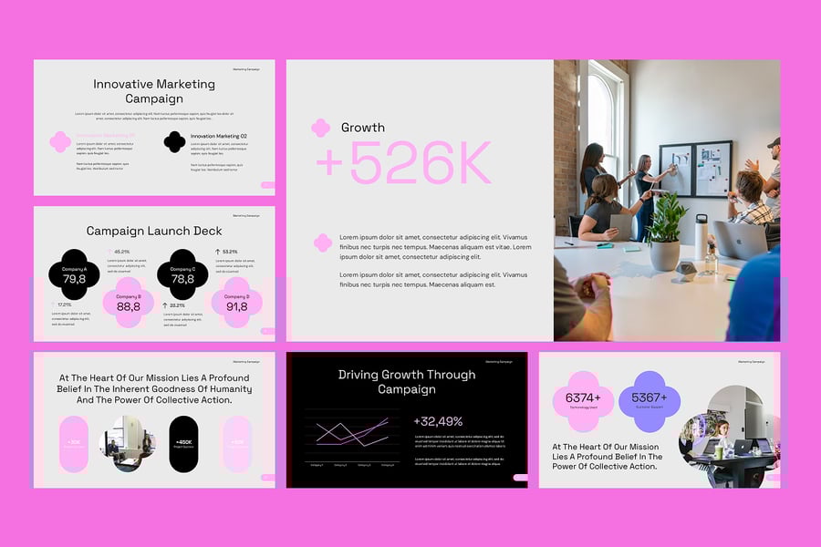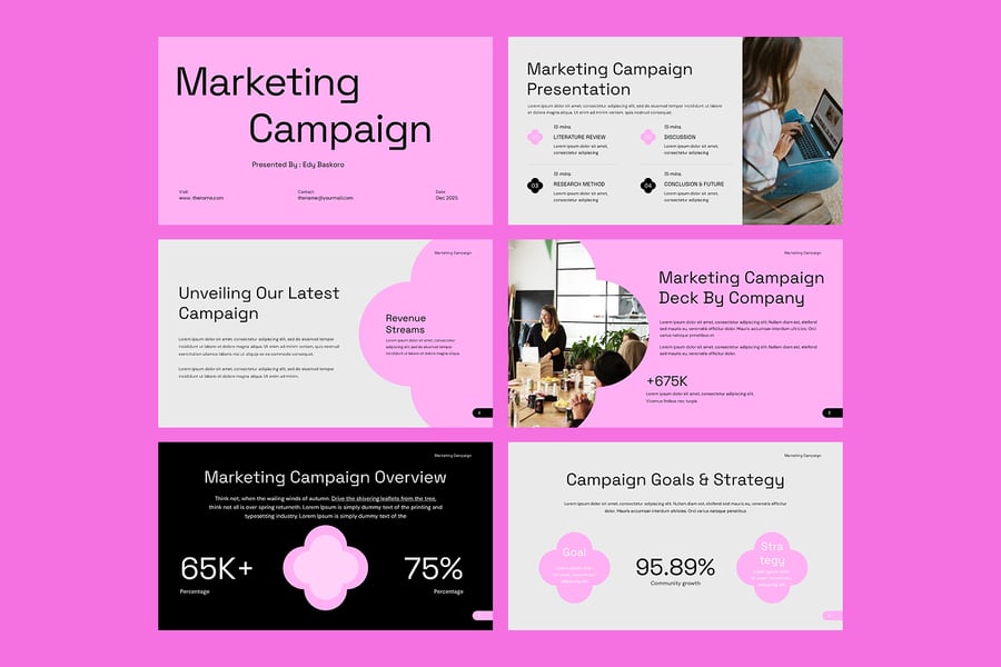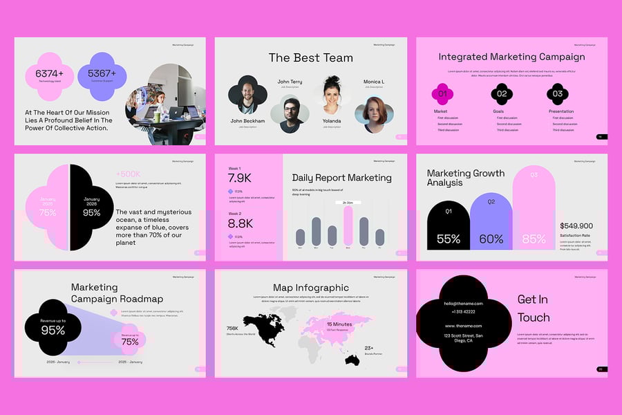 其简洁的设计、数据驱动的信息图表和完全可编辑的布局,让您可以轻松调整颜色、字体和内容,以契合您的品牌形象。节省时间,保持一致性,并以精美专业的营销活动演示文稿打动客户或利益相关者,建立信任并取得成效。这款营销活动 PowerPoint 模板是希望更智能地规划、更好地进行提案并取得营销成功的专业人士的理想之选。