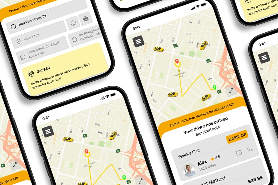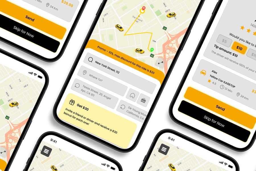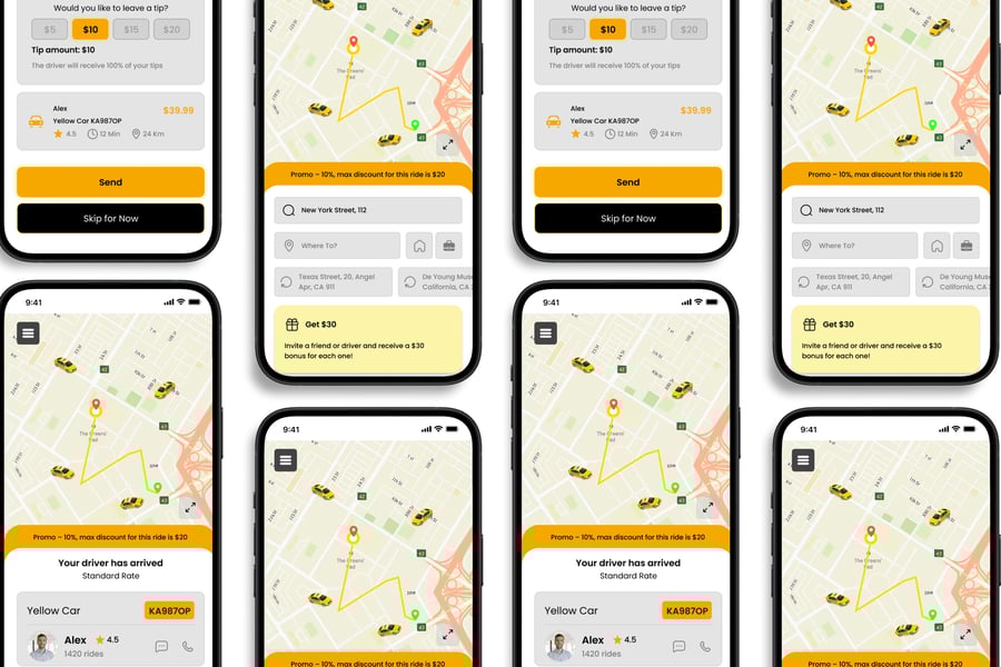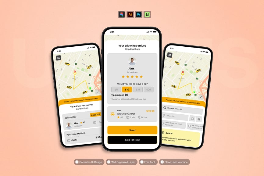 **Taxi Online** UI 套件的设计重点在于易用性和一致性,让您轻松创建美观实用的移动应用程序。每个元素都经过精心构建,完全可定制,并可随时适配您的品牌。无论您是设计社交应用、电商应用还是效率工具,此套件都能让您灵活地将创意变为现实。
