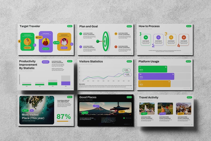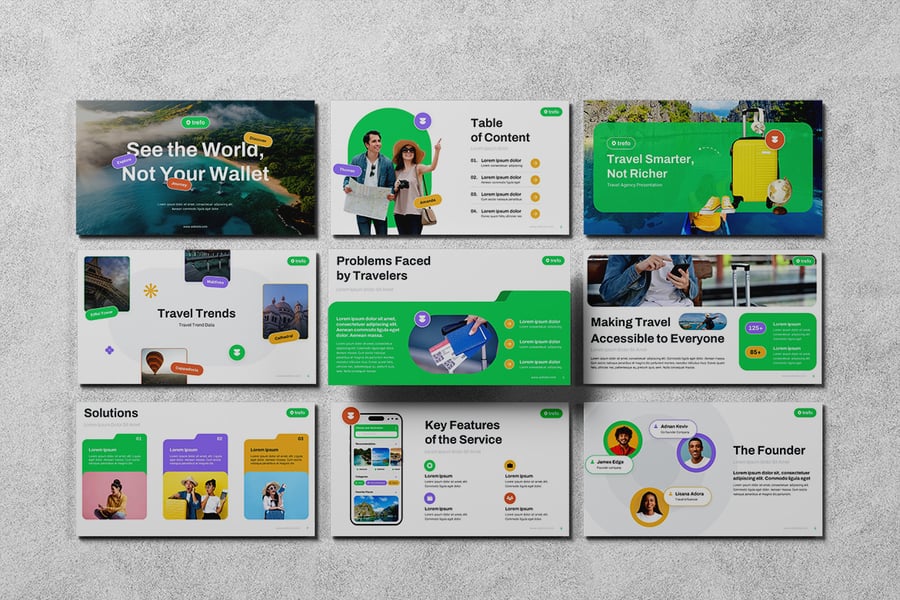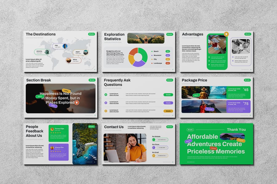 使用我们的旅行社演示模板,让您的旅行计划变得简单而精彩。该模板旨在激发您的旅行热情,并以时尚的方式展示目的地,同时还通过集成应用程序预订和安全支付解决方案,强调便捷性。无论是展示梦想之旅、旅行套餐还是团体旅游,您不仅可以突出旅行体验,还可以强调预订的便捷性。该模板非常适合希望以创意和创新给客户留下深刻印象的旅行社、旅游运营商和旅游创业公司。