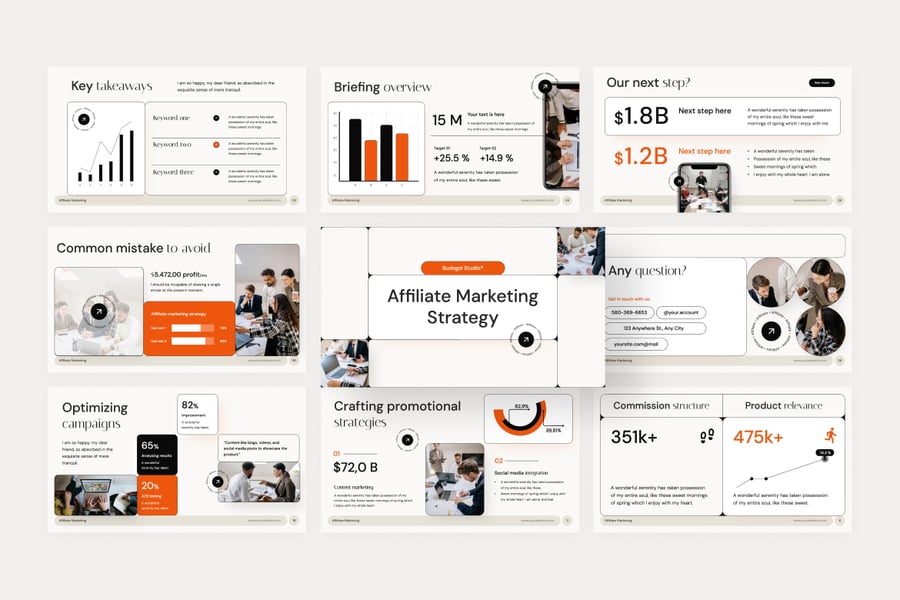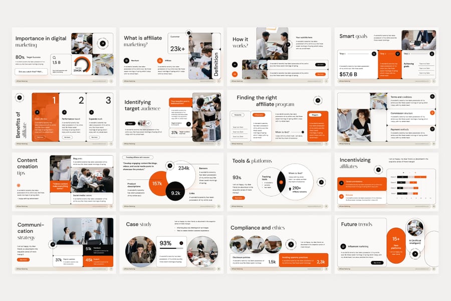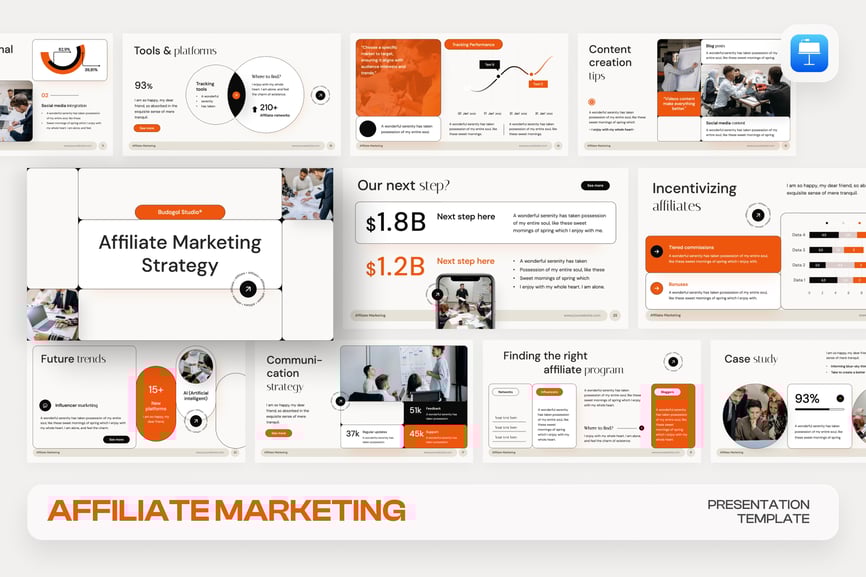 是一款现代创意风格的演示模板,非常适合用于联盟营销、报告、计划、商业演示、产品图册幻灯片、项目推介等多种用途。
