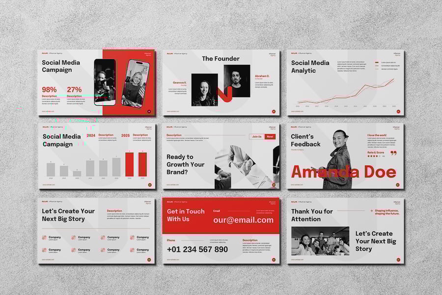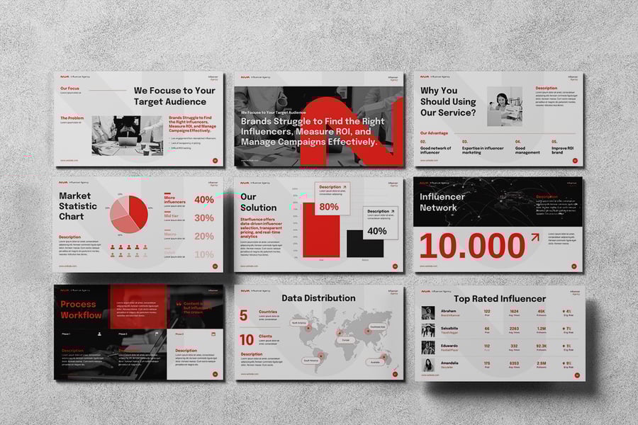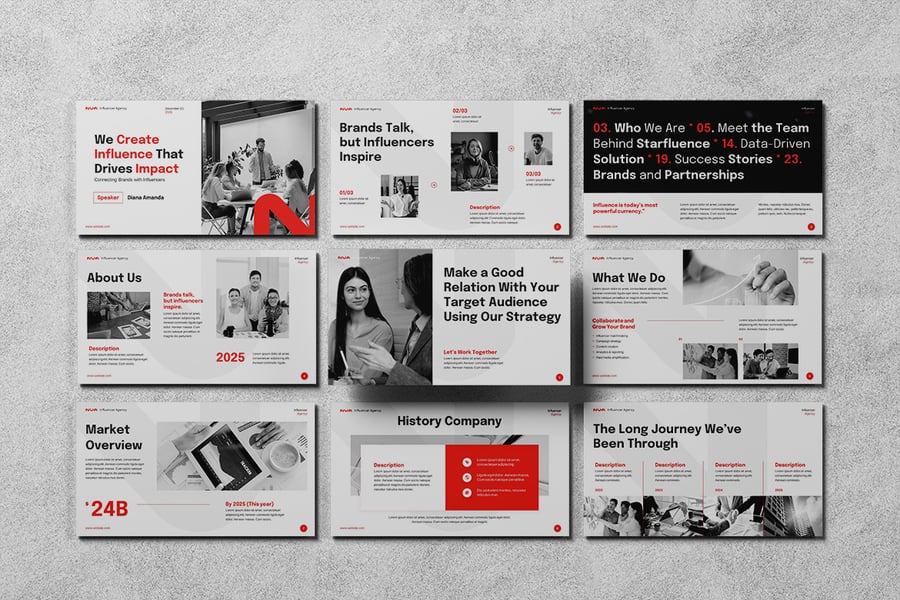 想自信而富有创意地展现贵公司的愿景吗?这款创意机构主题演讲模板专为需要展示提案、活动或作品集的机构、工作室和创意专业人士而设计。凭借简洁的布局、醒目的视觉效果和可自定义的元素,该模板能将您的想法转化为引人入胜的故事,激发行动。它非常适合客户提案、品牌故事讲述、营销策略和项目展示,助您给观众留下深刻印象,赢得商机。