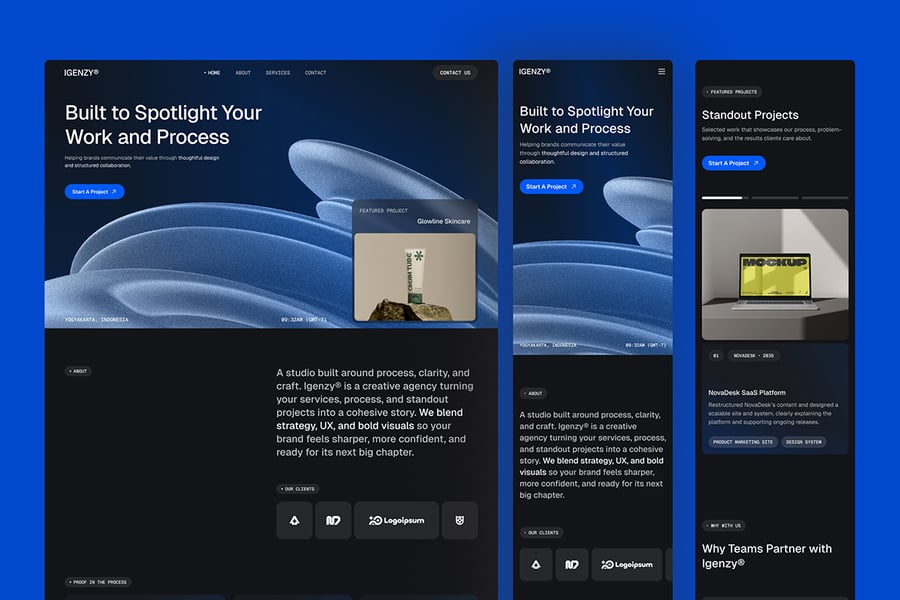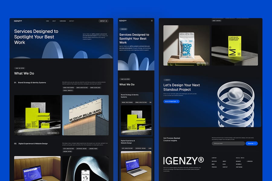 Igenzy 采用简洁、富有氛围的视觉风格,其灵感来源于数字产品和品牌工作室: