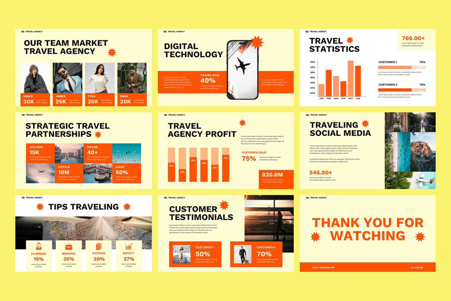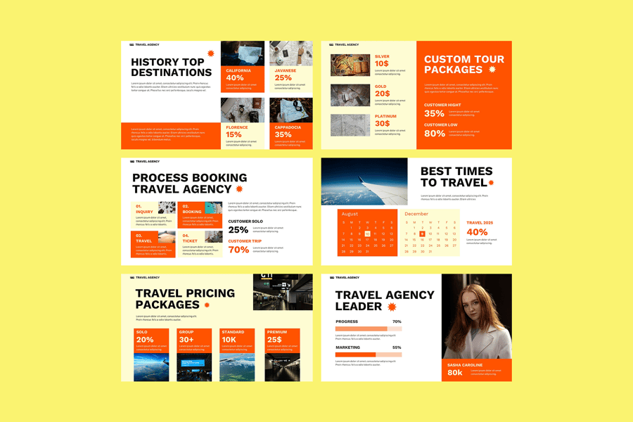 使用这款旅行社谷歌幻灯片演示模板,给投资者留下深刻印象,并清晰传达您的愿景。此演示模板专为旅行社、旅游运营商和酒店业专业人士设计。它能帮助您以完美的视觉效果和信息平衡,展示目的地亮点、旅游套餐、行程安排和客户体验。模板包含多种幻灯片布局,涵盖公司简介、服务项目、定价方案、季节性促销活动和客户评价——所有内容都旨在吸引并留住您的观众。