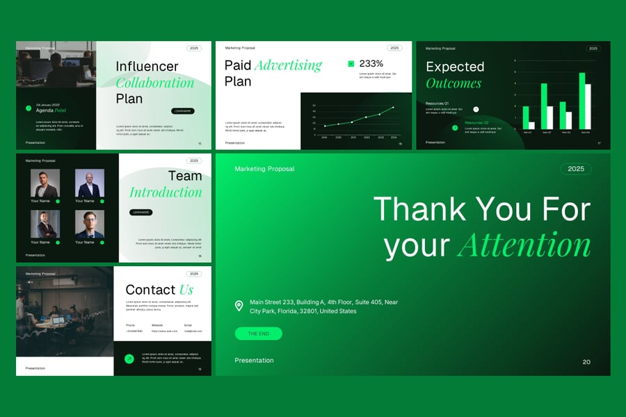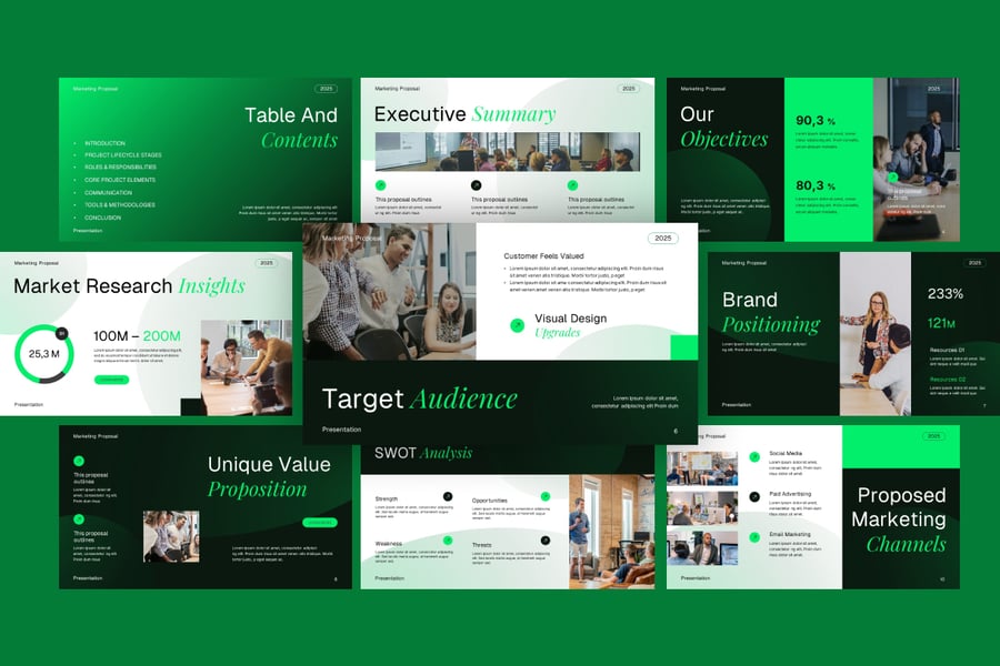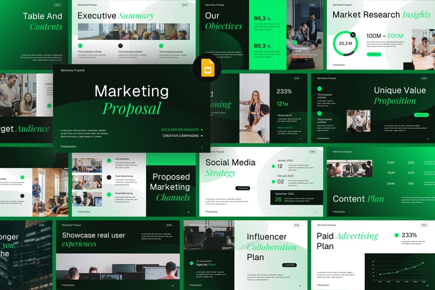 使用这款营销提案谷歌幻灯片演示模板,赢得客户并展现您的营销专长。这款简洁专业的模板专为营销机构、数字策略师、自由职业者、初创公司和企业团队设计,助您清晰自信地展示您的营销策略、活动创意和项目成果。