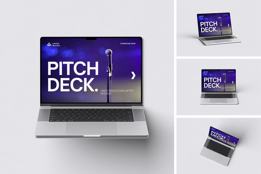 用这些精美的样机展示您的笔记本电脑样机设计。此样机包含 4 个项目,并提供分层清晰的 PSD 文件。此外,此样机还采用了智能对象功能,这意味着您只需几秒钟即可轻松快捷地将当前设计替换为您自己的设计。