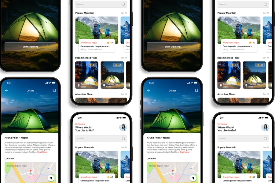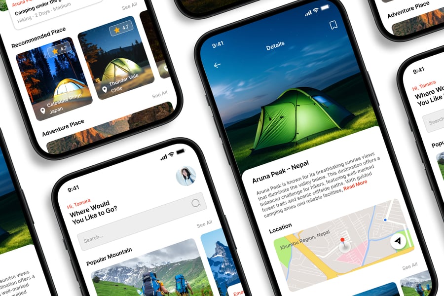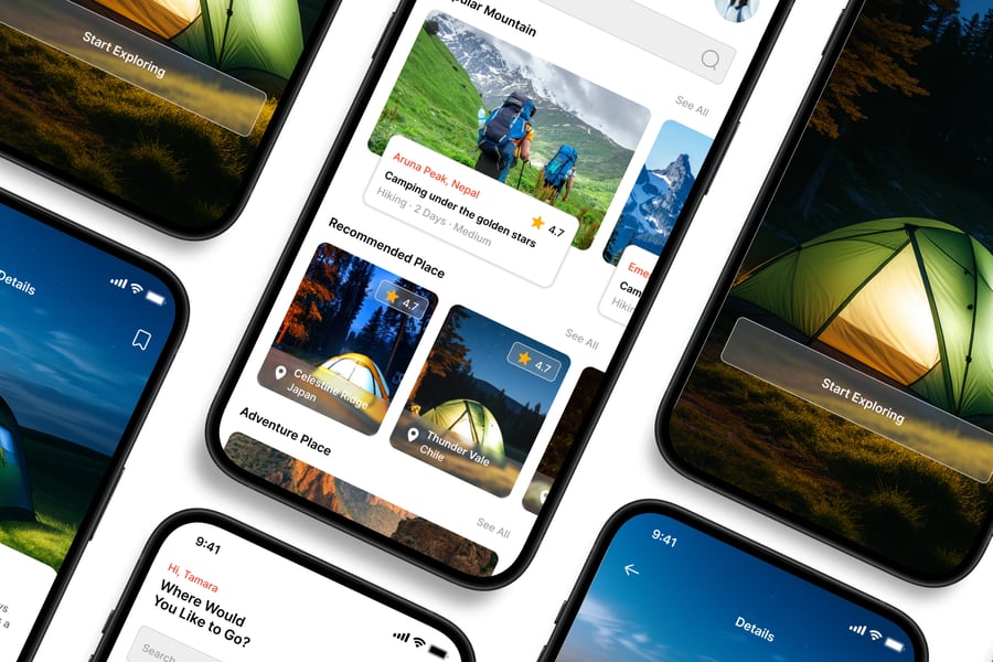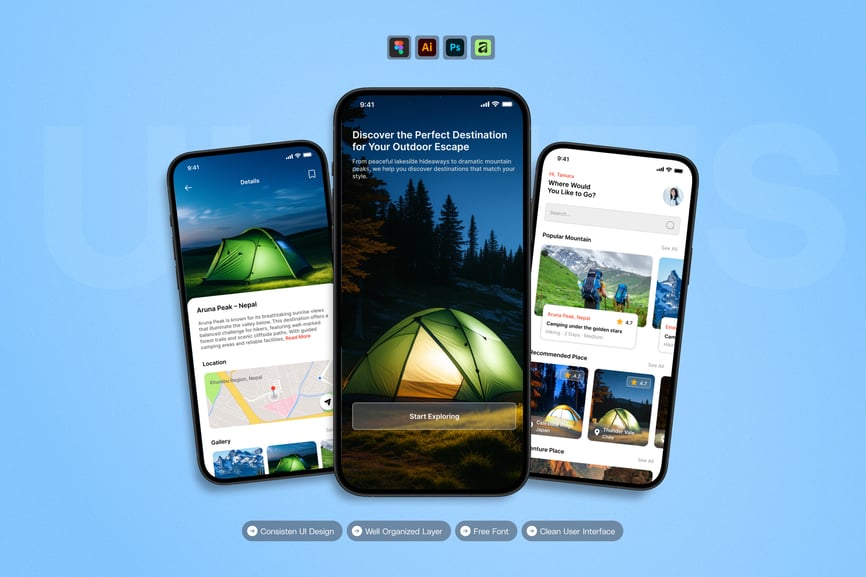 隆重推出 **Camp Destination** 移动应用 UI 套件,这是一款现代化且功能全面的解决方案,可助您创建简洁易用的应用界面。对于希望加快设计流程的设计师和开发者而言,这款 UI 套件堪称完美之选,它将您所需的所有基本组件整合在一个井然有序的软件包中。