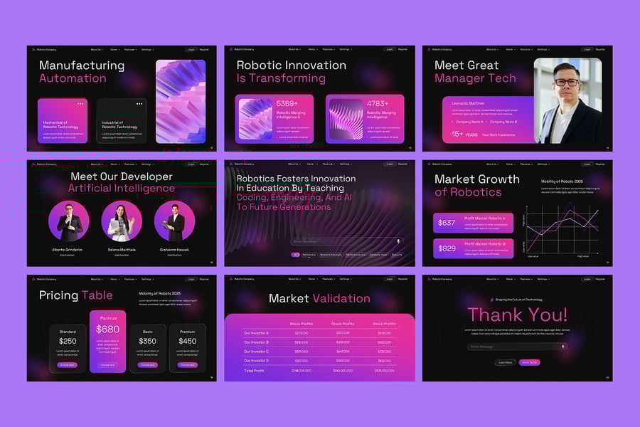 无论您是在科技峰会上发表演讲、推介人工智能产品,还是讲授机器人系统,这款模板都能以简洁前卫的风格吸引眼球,激发创新。它提供精心设计的幻灯片,用于展示贵公司的概况、问题分析和解决方案。凭借现代化的设计、引人入胜的视觉效果和可自定义的图表,它能有效提升故事叙述和数据可视化效果。这款模板适用于任何行业,助您打造引人注目、效果显著的精彩演讲。它尤其适用于人工智能技术、机器人、机器学习、初创公司路演和研究报告等主题。