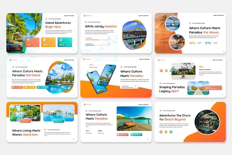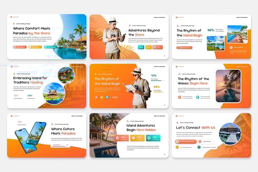 这款奢华、现代且完全可编辑的演示模板专为度假村、酒店、旅行社和度假相关企业量身打造。使用此模板,您将通过精致的视觉效果,瞬间打动客户、投资者或利益相关者,展现度假生活的优雅与宁静。