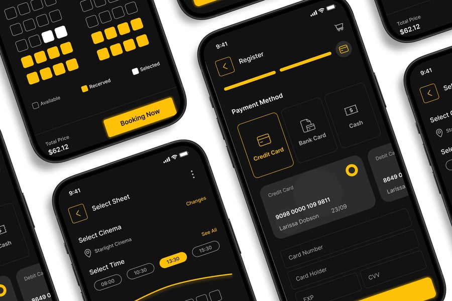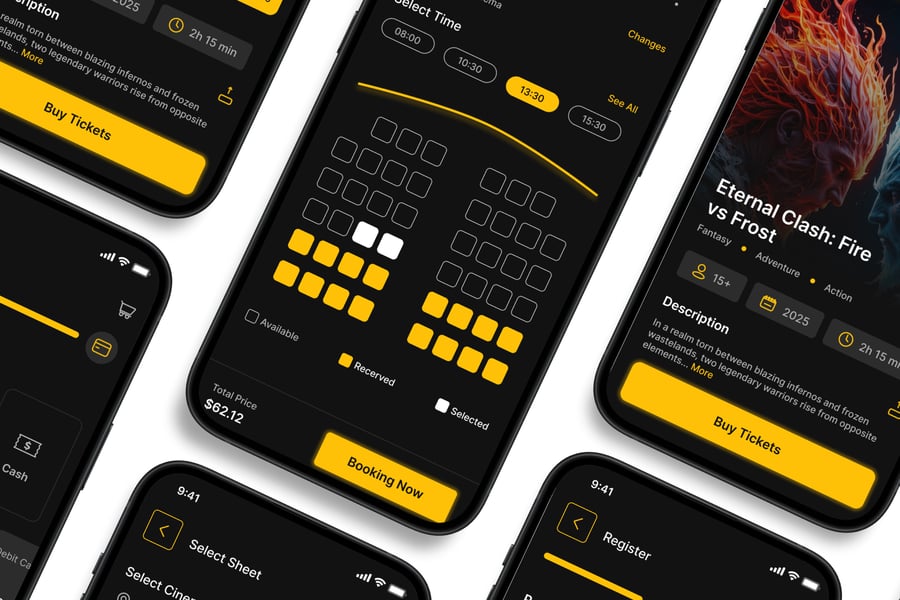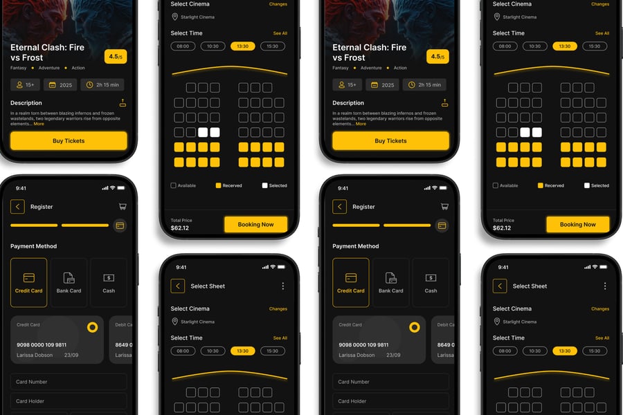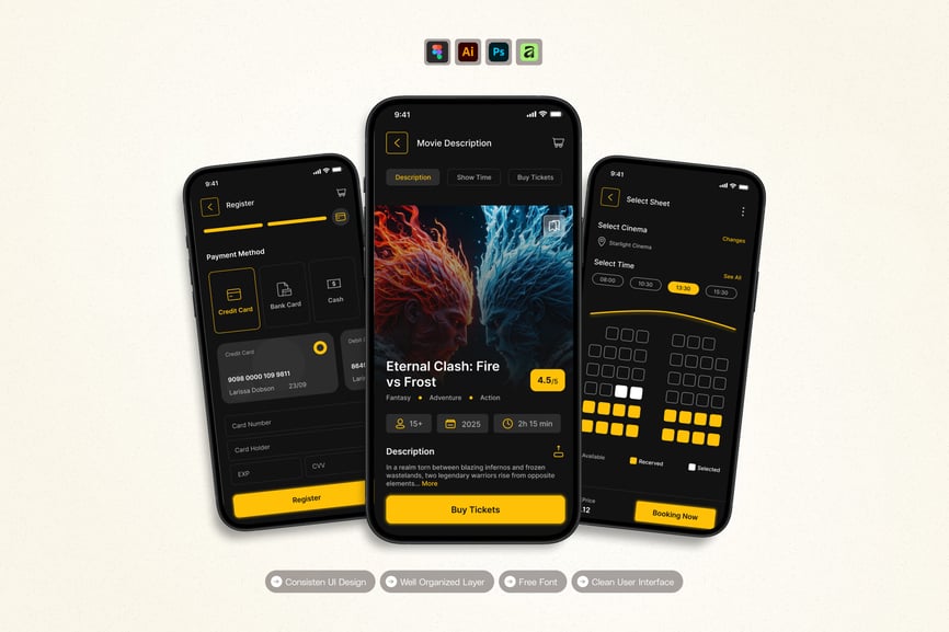 隆重推出 **影院订票** 移动应用 UI 套件,这是一款现代化且功能全面的解决方案,可助您创建简洁易用的应用界面。对于希望加快设计流程的设计师和开发者而言,这款 UI 套件堪称完美之选,它将您所需的所有基本组件整合在一个井然有序的软件包中。
