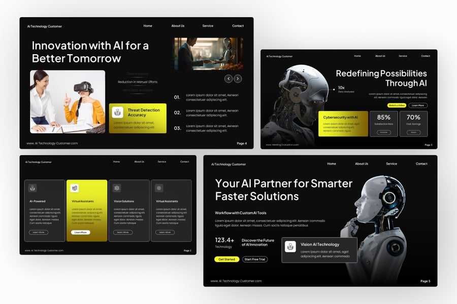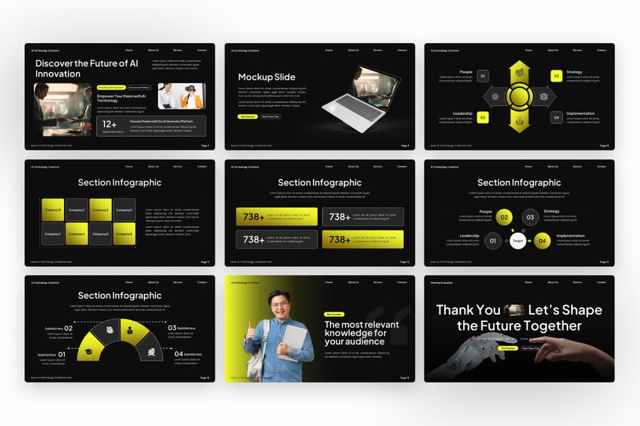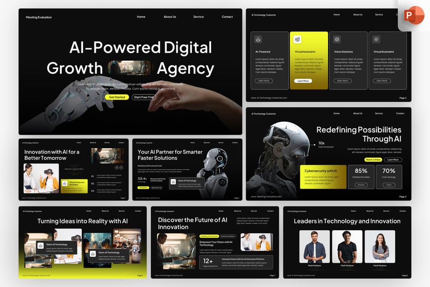 这款充满未来感的 PowerPoint 演示模板专为人工智能初创公司、科技公司和创新驱动型企业设计,包含 16 张高质量、完全可编辑的幻灯片。