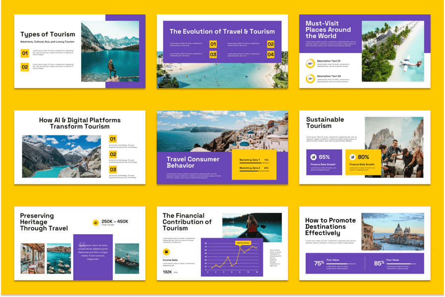 这款旅游主题谷歌幻灯片模板旨在帮助旅行社、旅游运营商和目的地营销人员展示他们的旅游套餐、行程安排和旅游策略。它包含一系列即用型幻灯片,涵盖目的地亮点、市场洞察、旅游路线、受众群体、定价方案和促销活动等内容。凭借精美的视觉效果和简洁的布局,这款模板可助您创建引人入胜的演示文稿,吸引游客并在全球范围内推广旅游体验。
