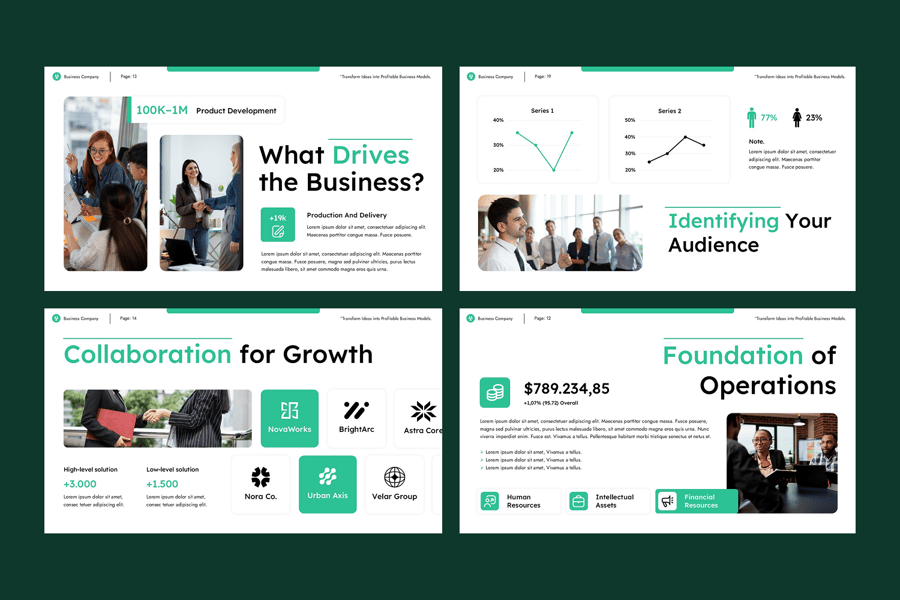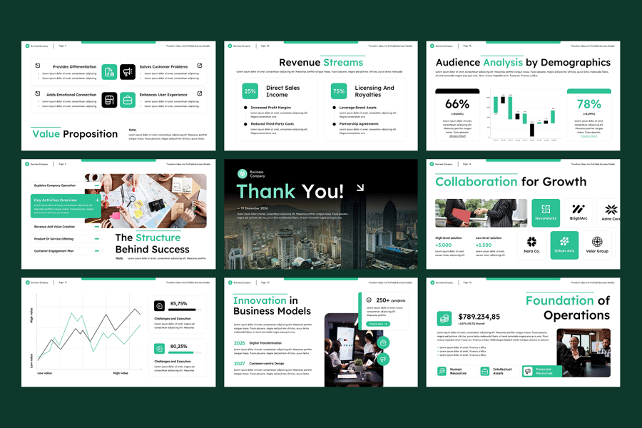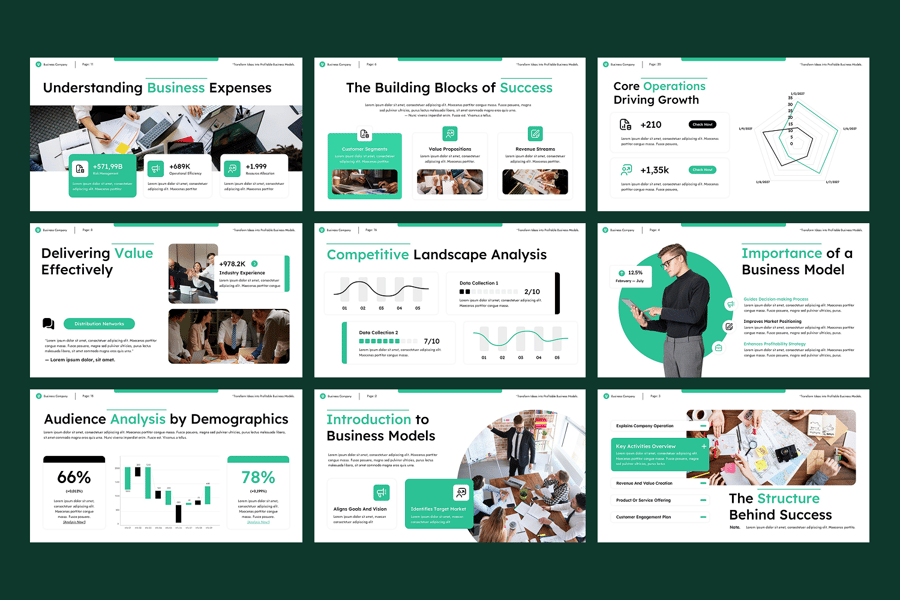 这款模板采用矢量图形、免费字体和拖放式图像占位符构建而成,可完全自定义,完美契合您的品牌形象。简洁、极简且富有策略性的演示设计,助您给观众留下深刻印象,让您的商业故事脱颖而出。这款模板包含专业设计的幻灯片,可用于展示您业务的各个关键方面,从公司概况到问题解决方案分析,助您打造引人入胜的推介。其现代化的布局、可视化的图形和可编辑的图表,让您轻松讲述故事并有效地呈现数据。该模板可完全自定义,适用于任何行业,助您打造引人注目且效果显著的推介。适用于商业模式画布、SWOT 分析、价值主张、客户细分与渠道、关键合作伙伴与活动、财务预测、增长战略与路线图等。