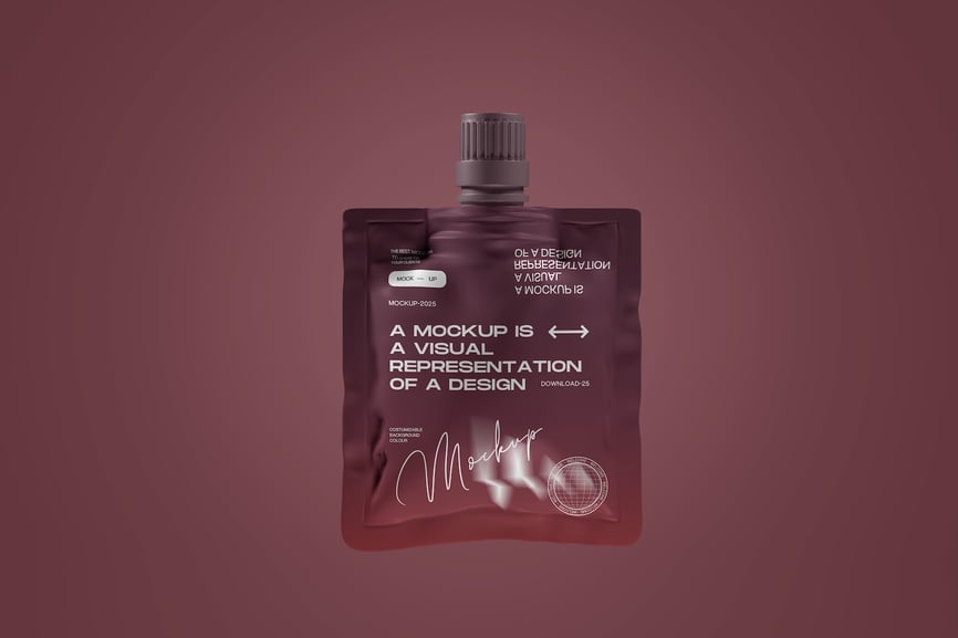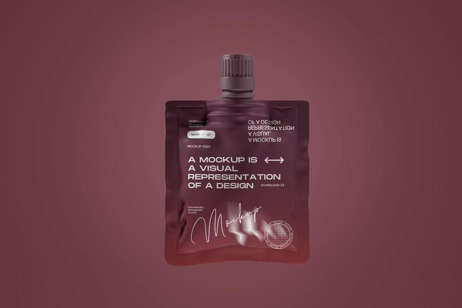 此模型展示了一款自立吸嘴袋包装设计,从正面视角呈现逼真的折叠效果和细节。它适用于展示食品、饮料、化妆品或液体产品的包装概念