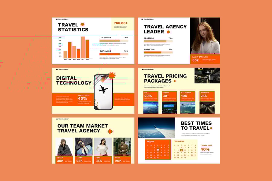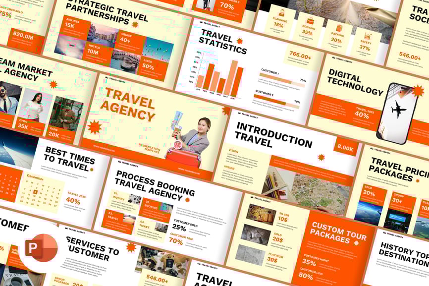 使用旅行社 PowerPoint 演示模板,给投资者留下深刻印象,并清晰传达您的愿景。这款旅行社演示模板是一套充满活力且专业的幻灯片,专为旅行社、旅游运营商和旅游企业设计,旨在有效地展示其服务、目的地和套餐。模板包含公司介绍、旅游套餐、目的地亮点、行程安排、价格方案、客户评价和预订详情等部分。