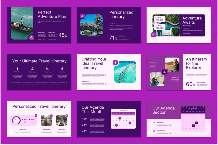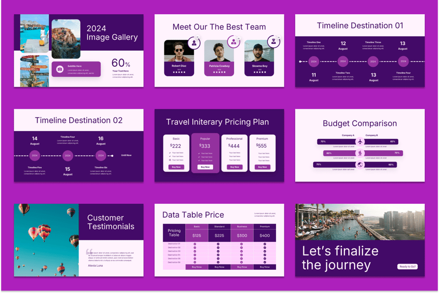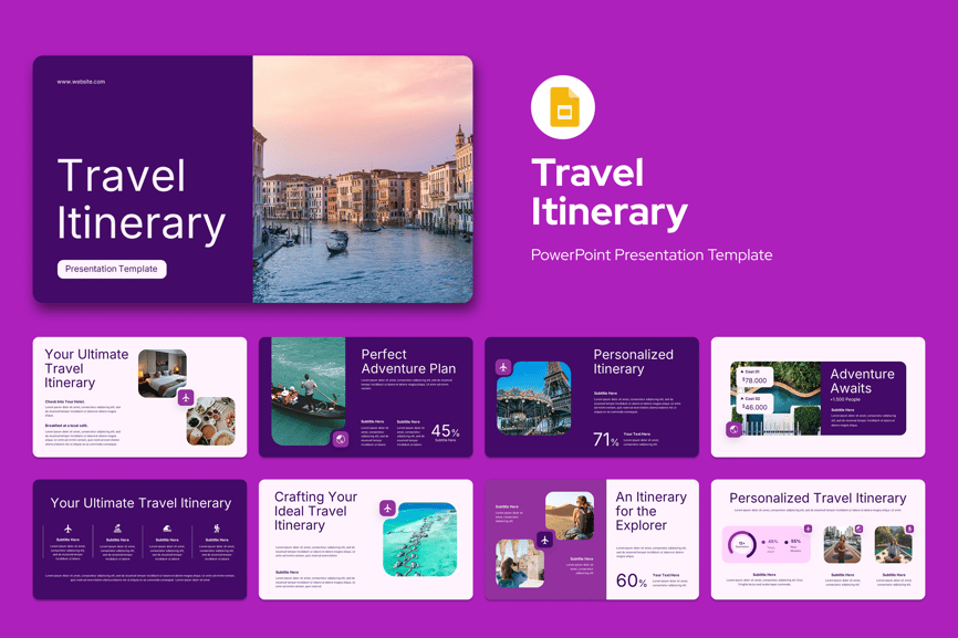 这款旅行行程 Google 幻灯片模板旨在帮助旅行社、旅游运营商和旅行爱好者以清晰美观的方式展示旅行计划和行程安排。它包含目的地、行程安排、住宿选择、交通信息、活动亮点和价格明细等现成的幻灯片。凭借优雅的视觉效果和便捷的自定义功能,该模板可确保每个旅行计划都呈现专业且引人入胜的效果。