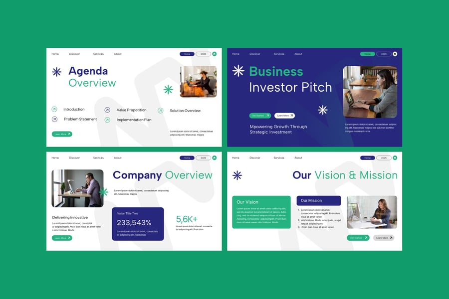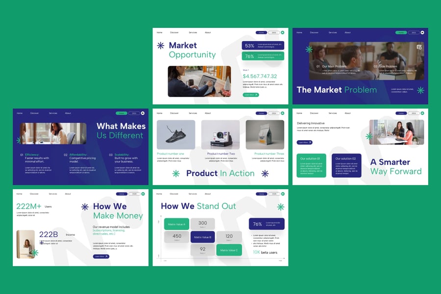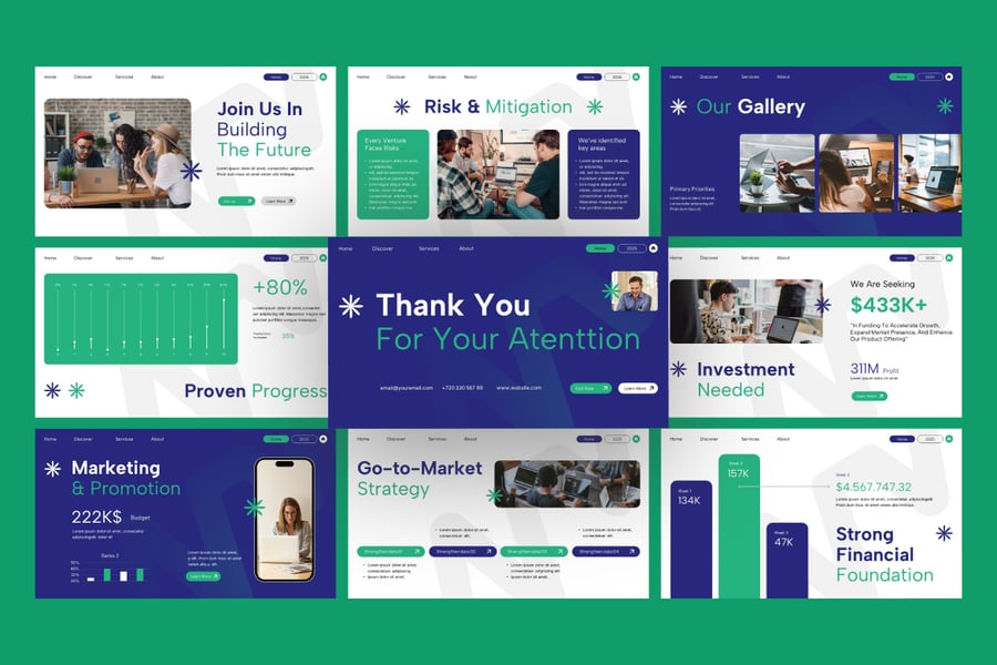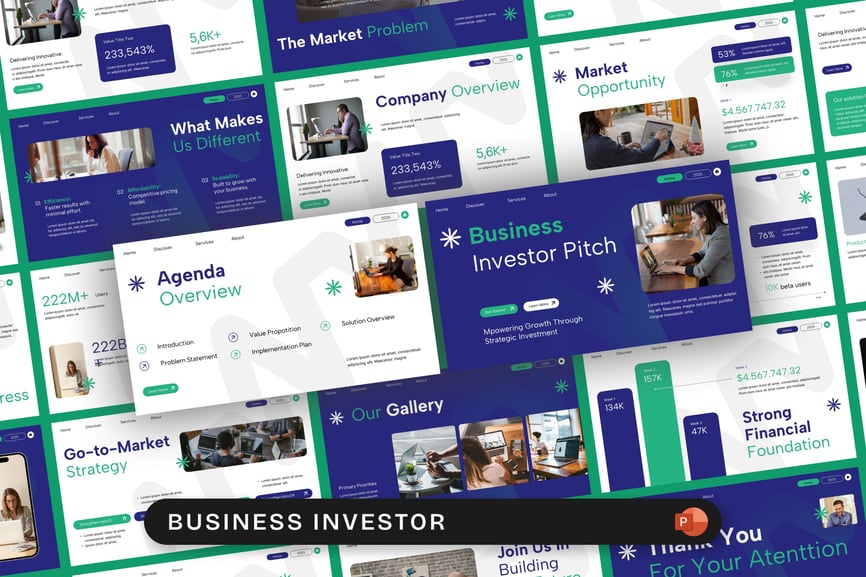 这款 PowerPoint 模板非常适合用于投资提案、初创企业融资演示文稿、风险投资会议、公司概况和财务报告,确保每一张幻灯片都能传递价值和可信度。其简约的设计、现代的字体和统一的配色方案,使其易于定制,适用于任何商业领域或行业。