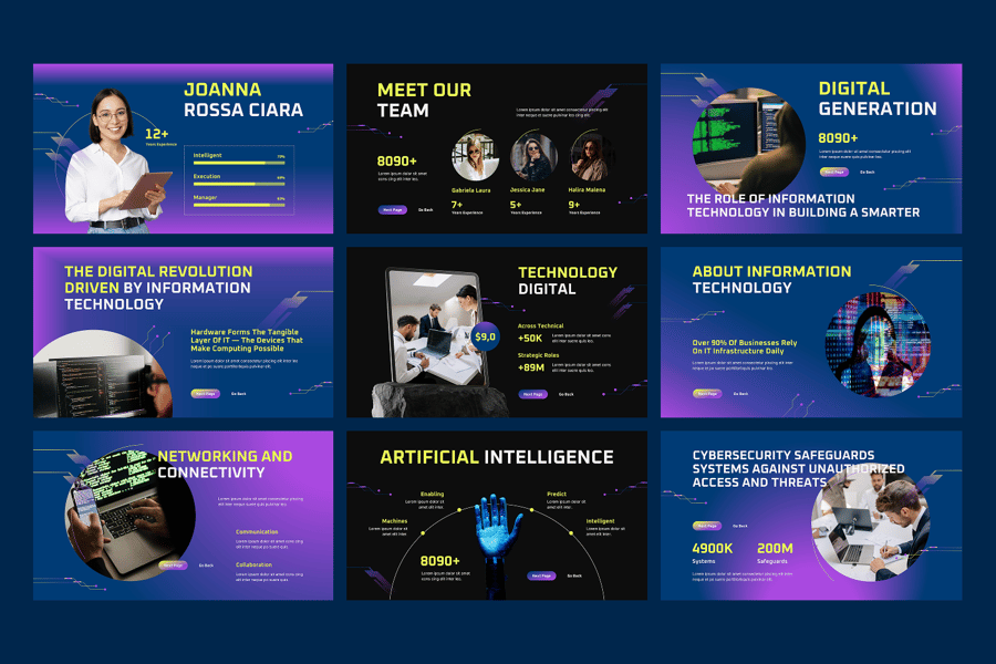 这款模板采用现代科技主题设计,布局清晰,字体简洁,视觉效果专业,每张幻灯片都能精准地传达IT概念和策略。信息图表、示意图、示意图和视觉占位符可用于展示工作流程、系统设计、性能指标和项目计划。该模板非常适合团队简报、客户演示、IT提案和技术研讨会,助您打造专业、精彩且极具视觉冲击力的信息技术演示文稿。