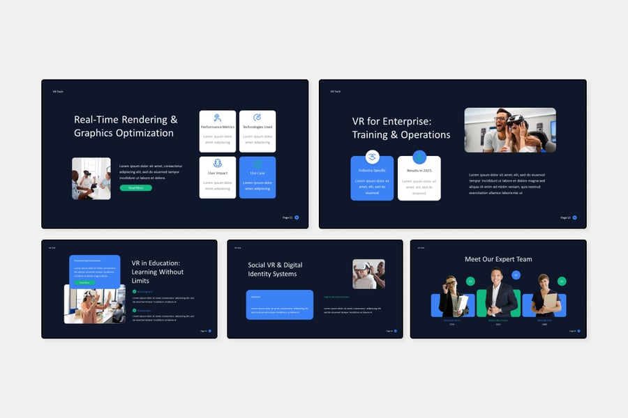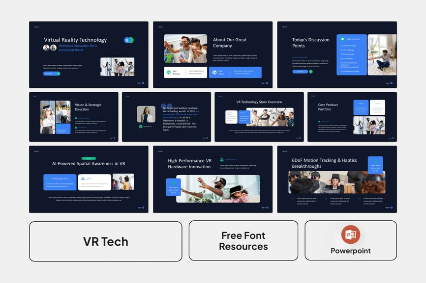 这款专为科技创新者、产品团队和数字内容创作者打造的VR技术演示模板,旨在清晰有力地展示沉浸式解决方案、演示虚拟体验并传达突破性理念。该模板适用于产品发布会、投资者会议、科技大会和企业创新路演,融合了现代设计、引人入胜的叙事手法和动态视觉效果,能够有效吸引眼球,并突出您的VR实力。