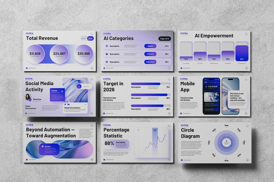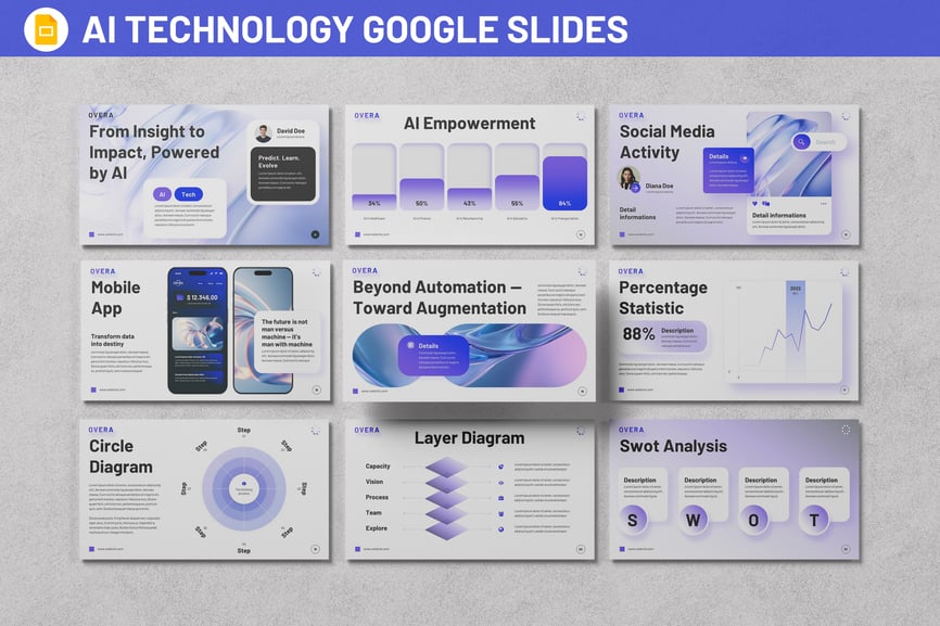 这款人工智能技术谷歌幻灯片模板旨在帮助初创公司、创新者和商业人士清晰有效地传达人工智能概念。它采用简洁的布局、可编辑的图表和现代化的视觉效果,将复杂的数据转化为易于理解的故事。无论您是推介人工智能驱动的解决方案、展示研究成果,还是与团队共同制定数字化战略,这款模板都能让您的信息保持专业性和吸引力。它非常适合产品发布、创新路线图、投资者演示文稿或学术演讲——完全可自定义,并支持在谷歌幻灯片中进行实时协作。