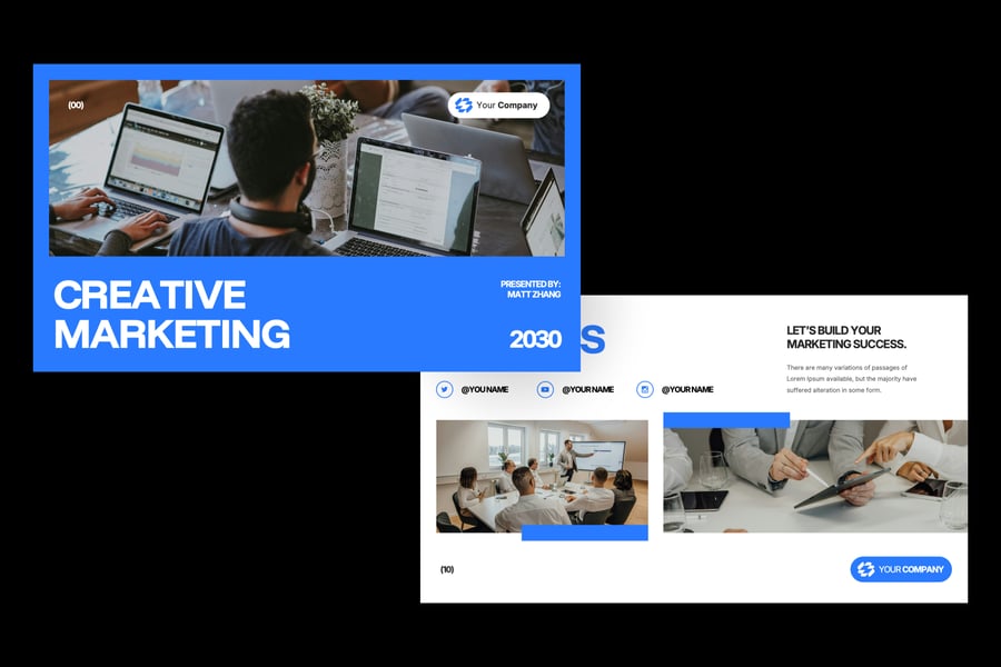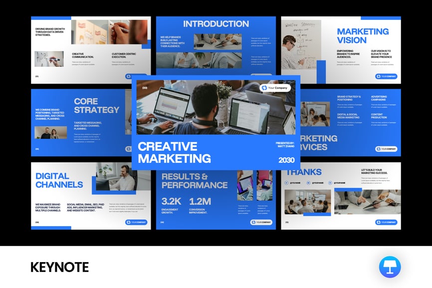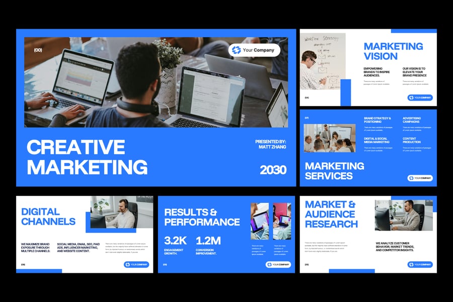 使用这款现代简洁的营销演示模板,自信地展示您的营销策略。该模板专为代理商、初创公司、品牌战略师和数字营销人员设计,可帮助您清晰、专业地传达理念。