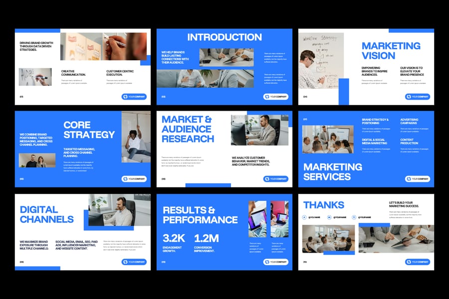 该演示文稿采用醒目的字体、极简的布局和结构化的内容块,非常适合用于营销计划、提案演示文稿、客户提案、品牌演示和社交媒体战略报告。