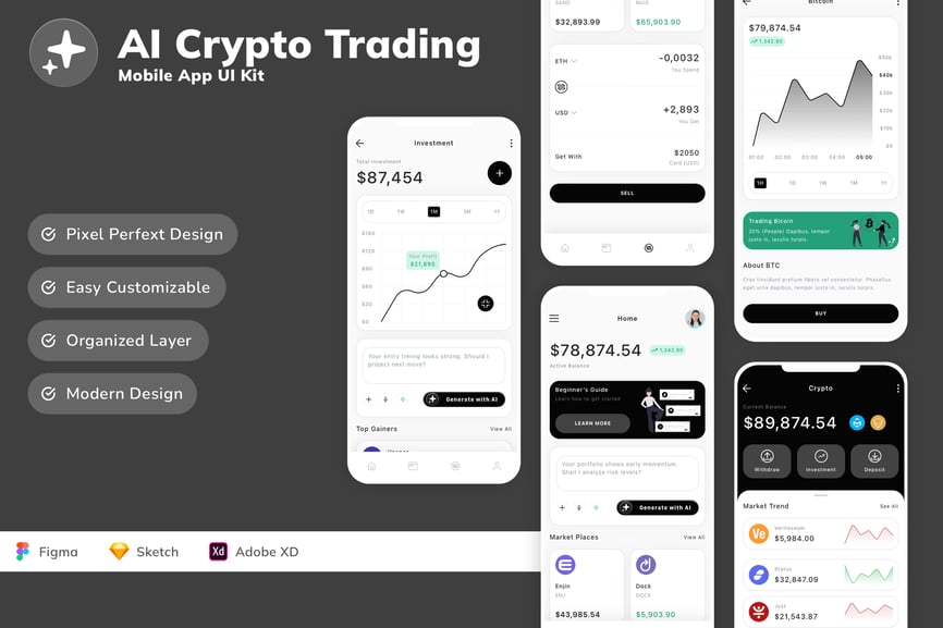 每个屏幕都可完全自定义,易于使用,并针对 Figma、Sketch 和 Adobe XD 进行了精心设计。