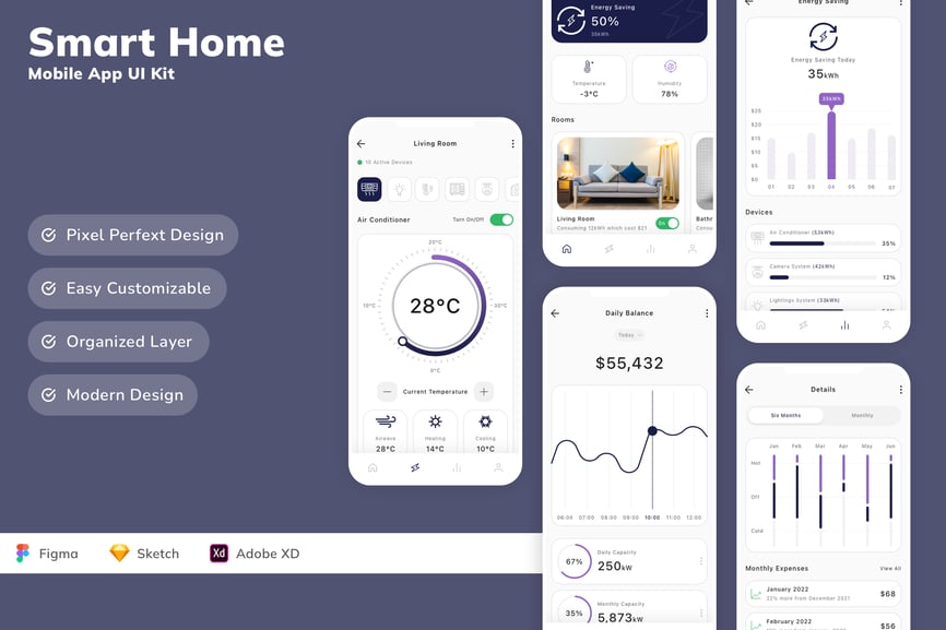 每个屏幕都可完全自定义,易于使用,并针对 Figma、Sketch 和 Adobe XD 进行了精心设计。