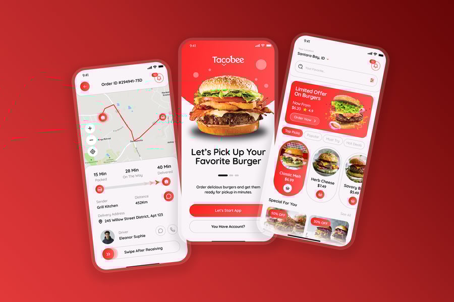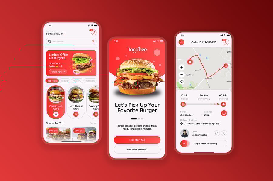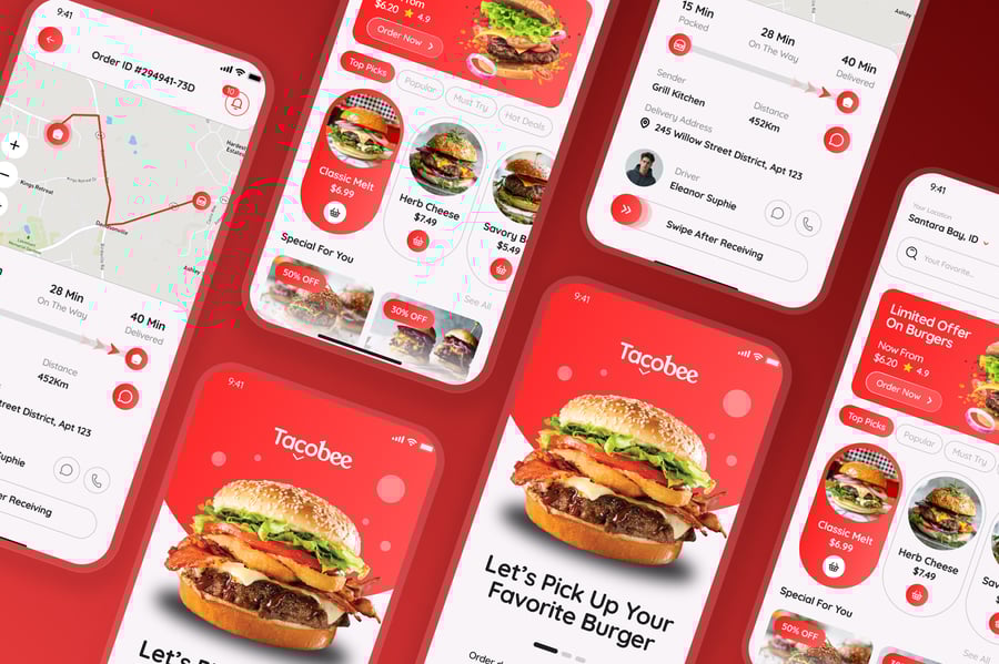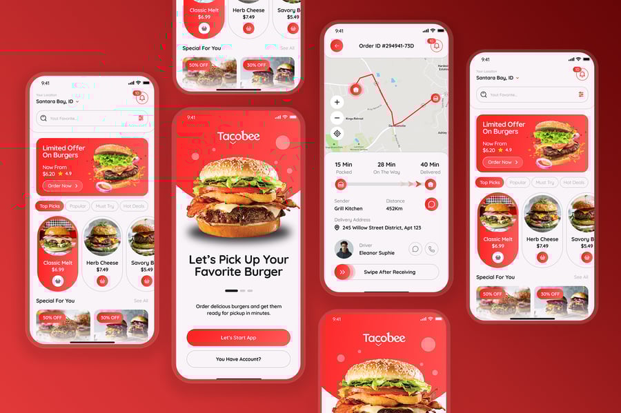 汉堡订购应用、外卖自取应用、餐厅移动应用、外卖配送用户界面、应用演示