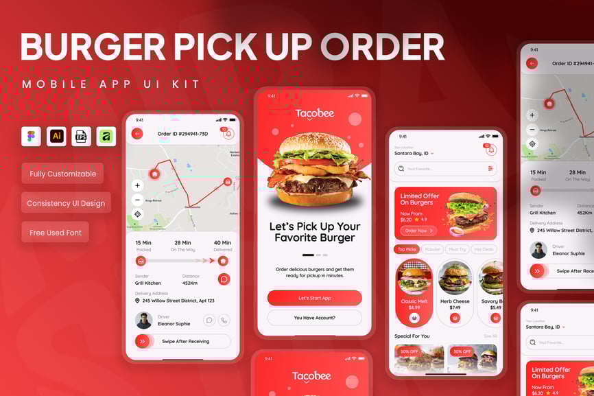 隆重推出汉堡外卖自取移动应用 UI 套件,其设计界面现代、简洁且赏心悦目,专为食品订购和自取服务量身打造。该 UI 套件可帮助设计师以清晰易懂、用户友好的移动体验,呈现汉堡菜单、订单定制、自取预约、订单跟踪和数字支付流程等功能。