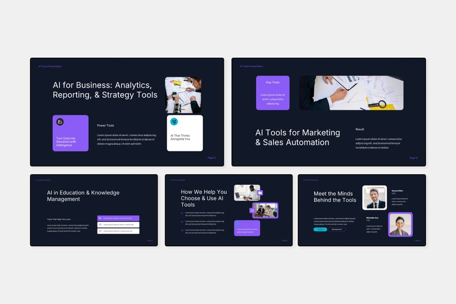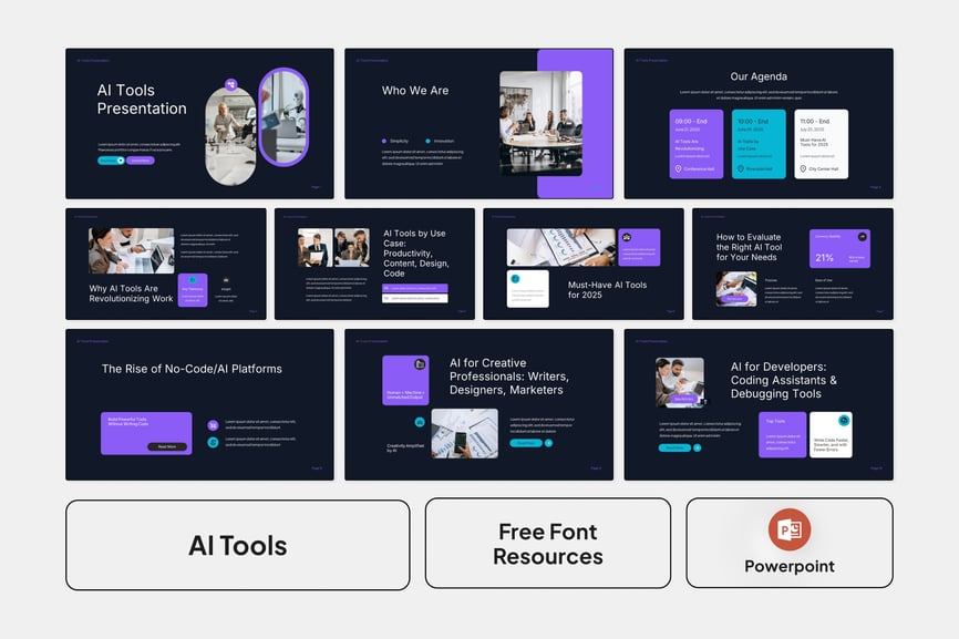 下载 AI 工具演示文稿,自信地展示您的创新成果,吸引投资者和客户,并以专业现代的设计展示您的 AI 解决方案。