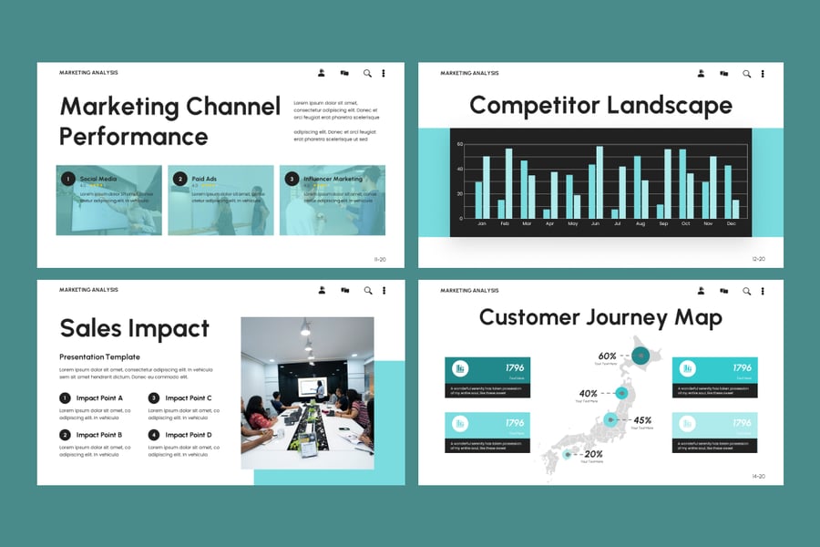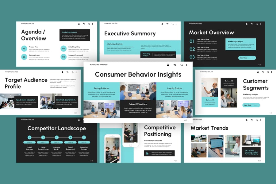 这款模板完美适用于市场调研报告、品牌分析、营销活动绩效评估和竞争格局演示,它将简约设计与专业功能完美结合。每张幻灯片都经过精心设计,旨在以引人入胜的方式讲述故事、呈现数据可视化效果并辅助战略决策。凭借独特的幻灯片、可编辑的信息图表和统一的色彩主题,这款演示文稿能够帮助您以精准的视觉方式传达营销成果。节省时间、打动利益相关者、让您的数据脱颖而出——这一切都得益于 Google 幻灯片的简洁性和兼容性。