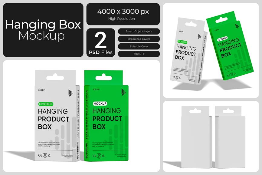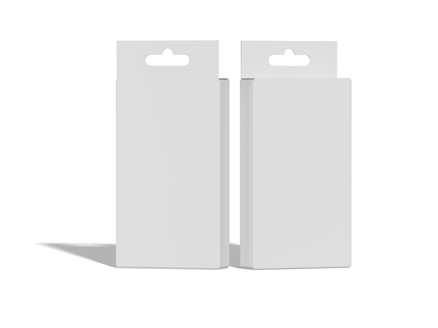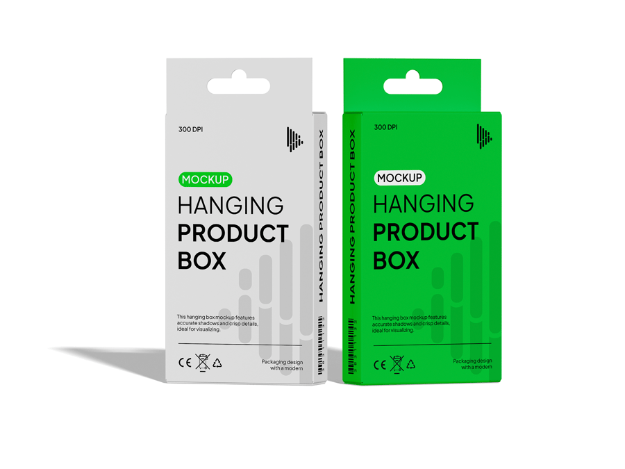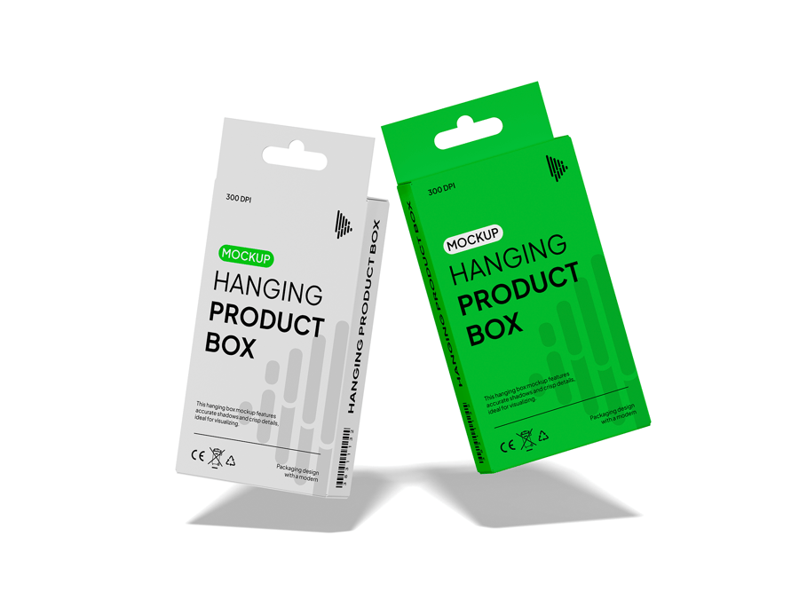 使用这款**悬挂式包装盒样机**,专业地展示您的零售包装设计。**这款样机非常适合用于展示货架商品、科技配件或食品**,它采用正面悬挂式纸盒设计,并带有可编辑的挂钩和模切选项。