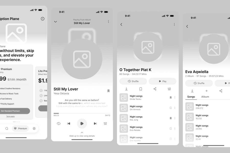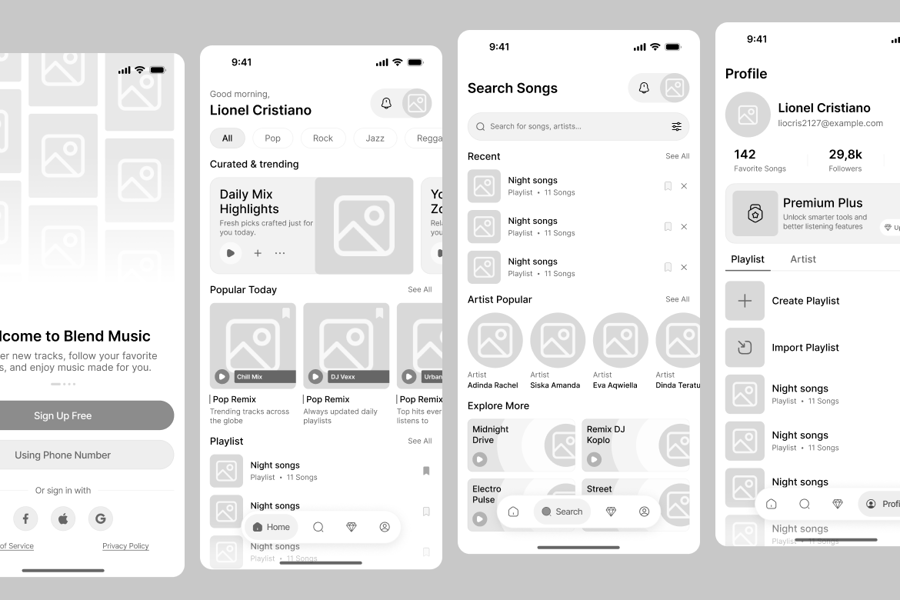 非常适合需要清晰、以用户为中心的线框图结构的音乐流媒体应用、播客平台、音频播放器、媒体创业公司或用户体验案例研究。