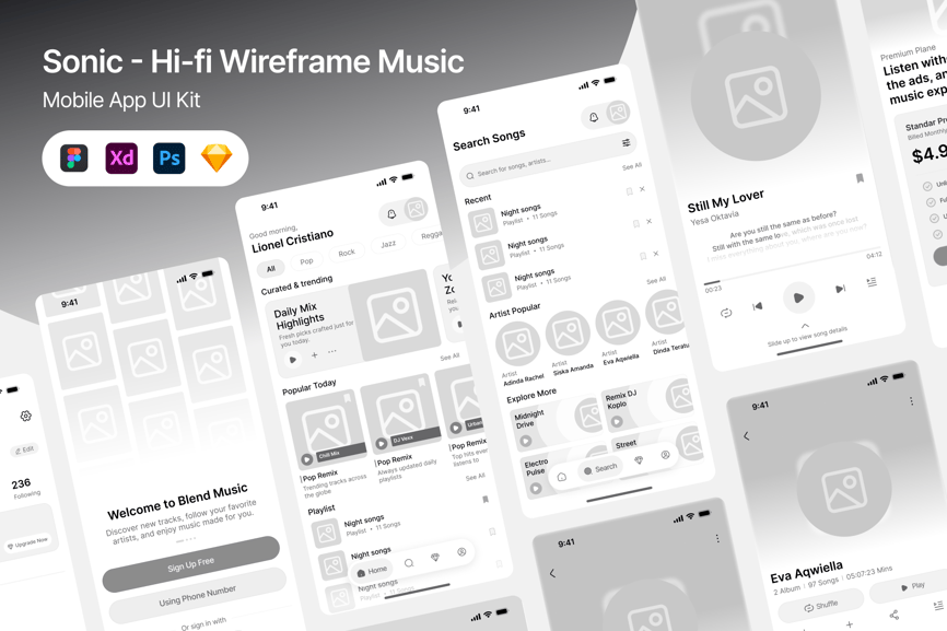 **Sonic – 高保真线框图音乐 UI/UX 套件**