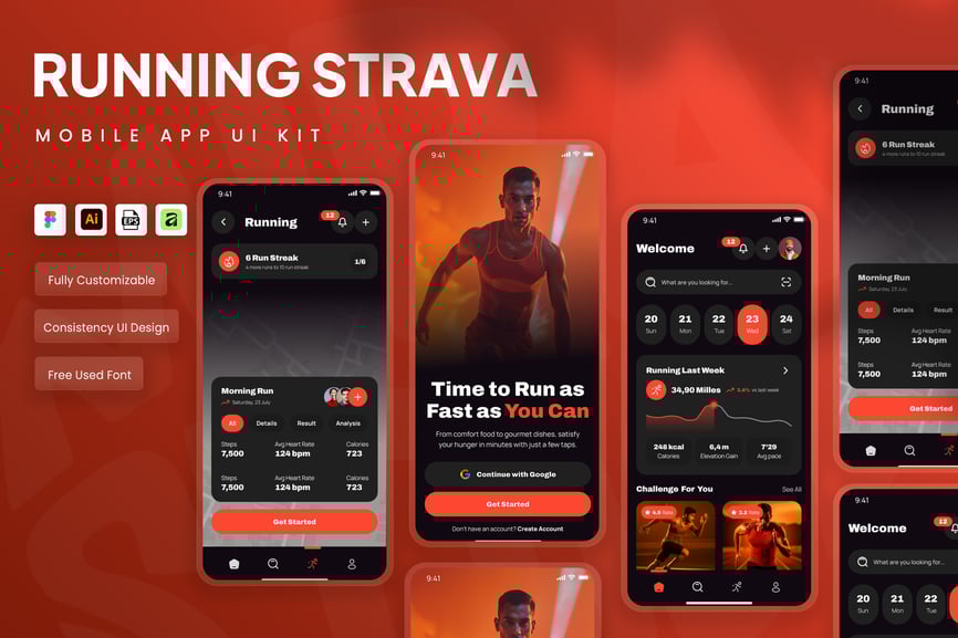 隆重推出 Kalcer 跑步移动应用 UI 套件,该套件现代而充满活力,专为专注于跑步活动追踪、马拉松训练、每日锻炼进度、GPS 路线追踪、配速和距离分析、排行榜竞赛、健身目标和社区挑战的应用而设计。该 UI 采用橙色、红色和海军蓝等动感十足的运动色彩,搭配简洁的字体,旨在为用户带来激励人心、以表现为导向的体验。