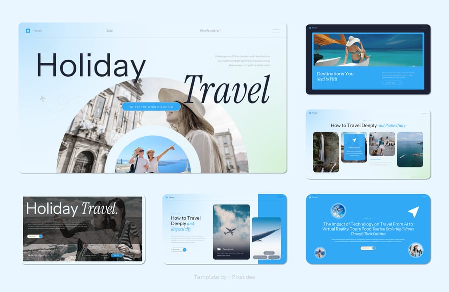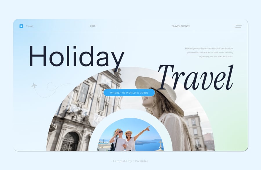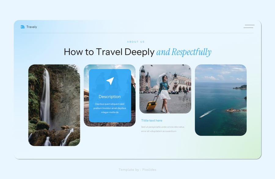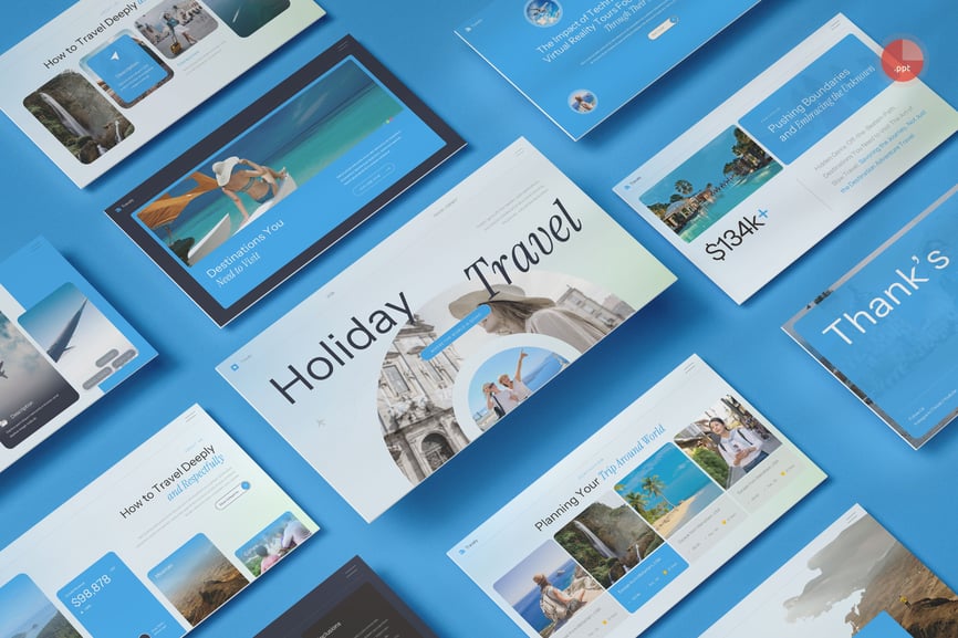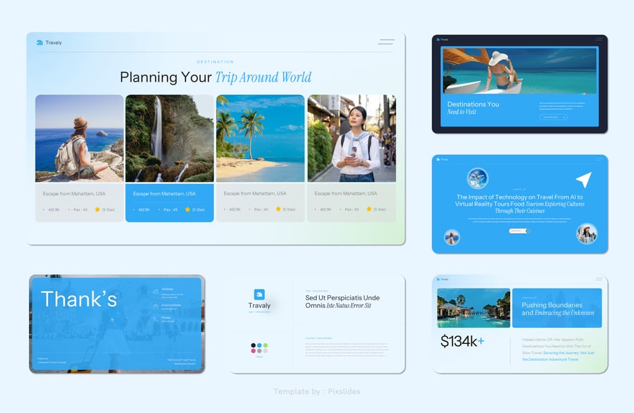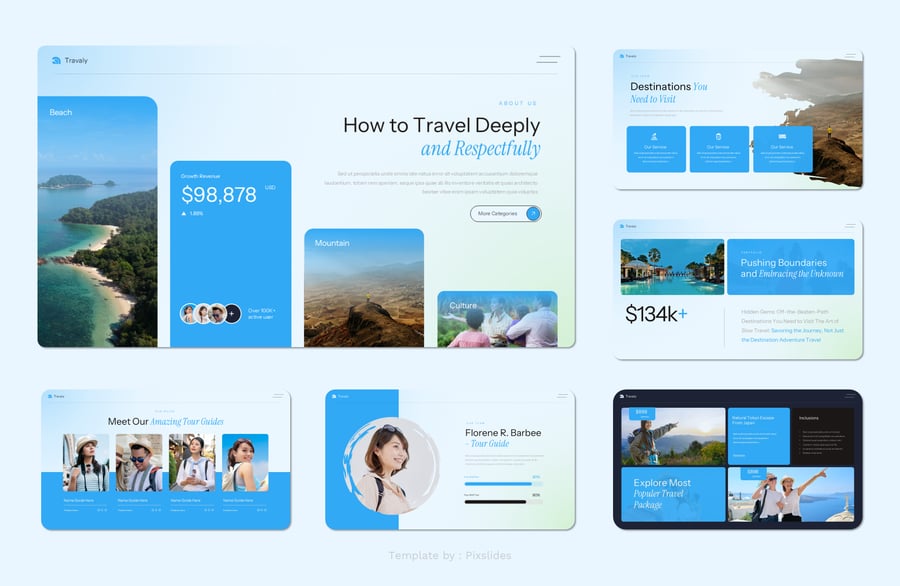 Travaly – 假日旅行演示模板。每张幻灯片都独具特色,而非重复的布局。只需使用 PowerPoint,即可为您的品牌创建精美的宣传资料,它非常适合用作数字媒体资料包、营销资料包或演示文稿。