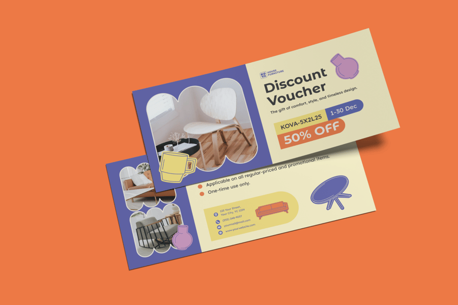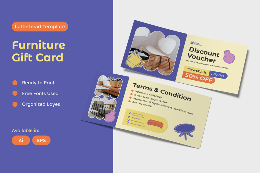 这款家具礼品卡模板设计时尚现代,适用于家具店、家居装饰品牌或室内产品促销。该模板布局时尚,留有填写折扣码、有效期和详细条款和条件的空间,有助于在促销、促销活动或季节性活动期间提升销量。模板支持 AI 和 EPS 格式,完全可编辑,使用免费字体,并采用可立即打印的格式,方便立即部署。
