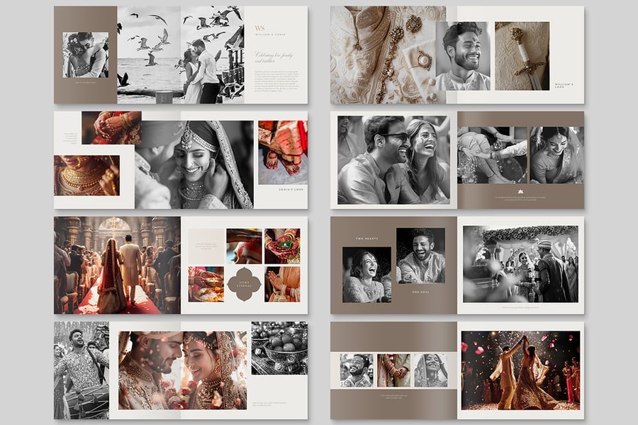印度婚礼相册模板——奢华的横向相册布局,用于捕捉曼海蒂、桑吉特、哈尔迪、订婚和婚宴的美好回忆。专为摄影师、工作室、策划师和寻求优雅拼贴故事书或咖啡桌纪念品的情侣设计。可打印的页面展示具有现代传统风格的肖像和仪式照片。