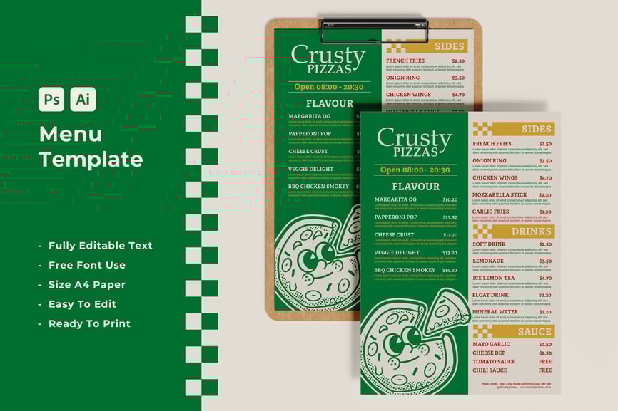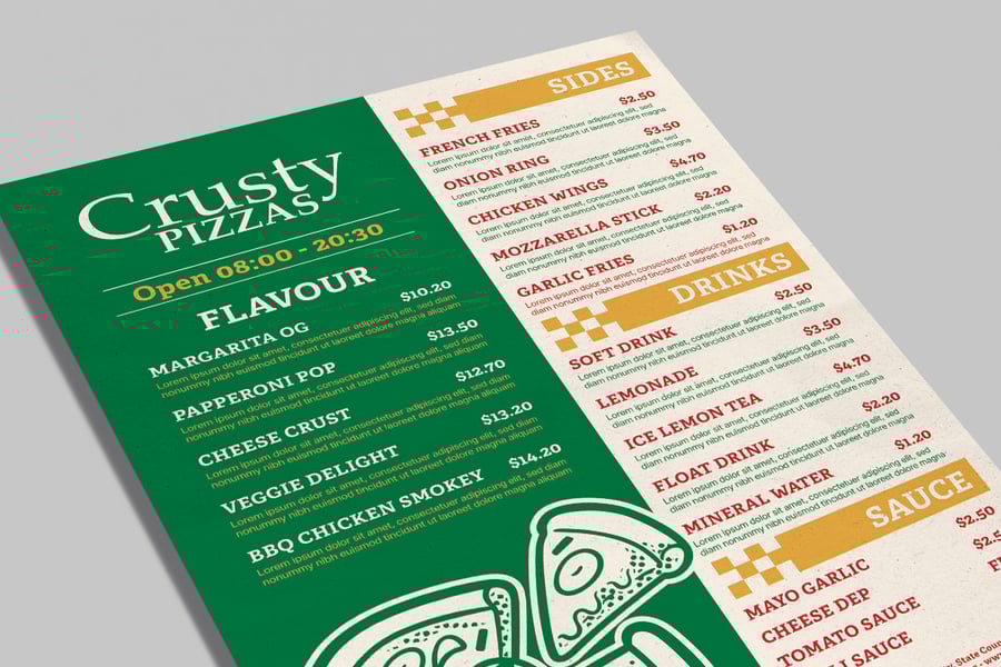 披萨菜单模板采用简约现代复古风格,完美契合您的餐厅或咖啡馆,营造温馨、地道的氛围。简洁的布局、复古的细节和大胆的字体,这些模板能够完美地凸显您的菜肴。完全可定制且可直接打印,非常适合希望脱颖而出的披萨店、意大利餐厅、咖啡馆和小酒馆。