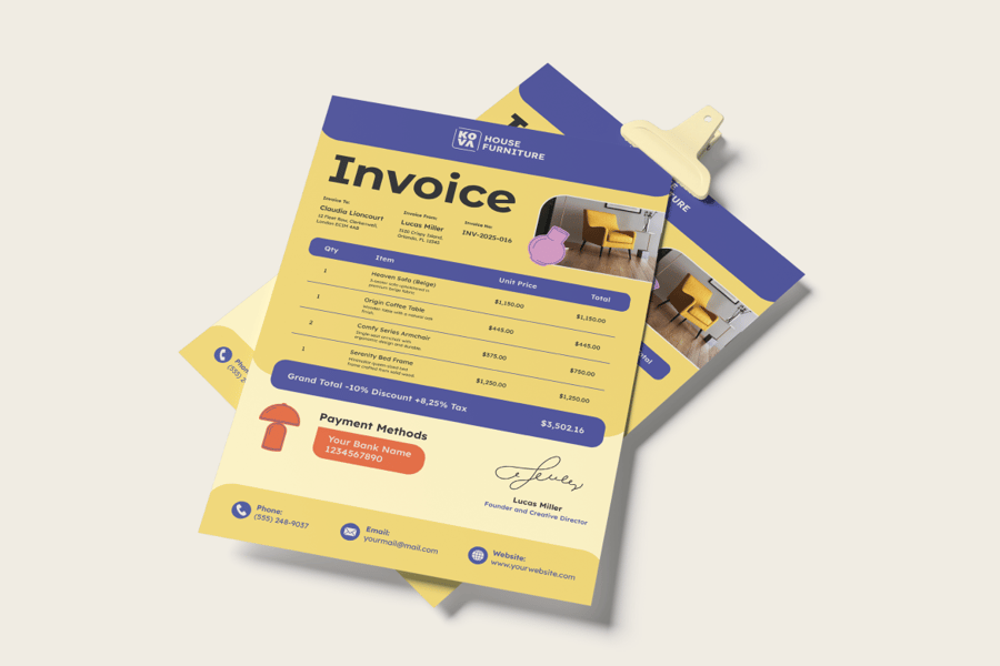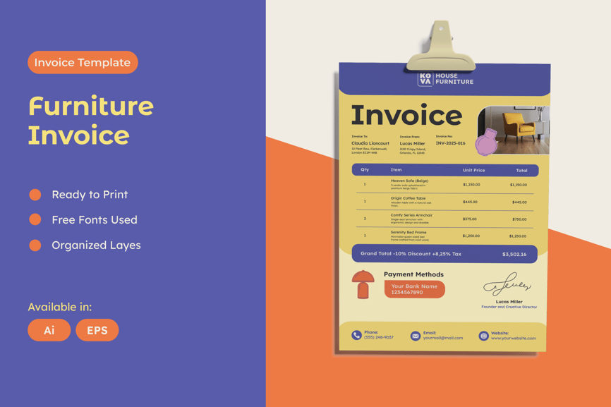 家具发票模板是一款专为家具企业、装饰店和室内品牌量身定制的现代专业账单文档。该模板包含可编辑的买家/卖家信息、明细列表、价格、折扣、税费和付款方式字段,可直接打印,并提供 AI 和 EPS 格式。该模板采用 KOVA 配色方案,采用大胆的品牌设计,提升您的专业性,同时保持文档清晰美观。