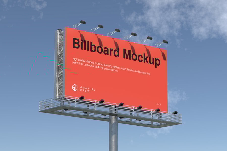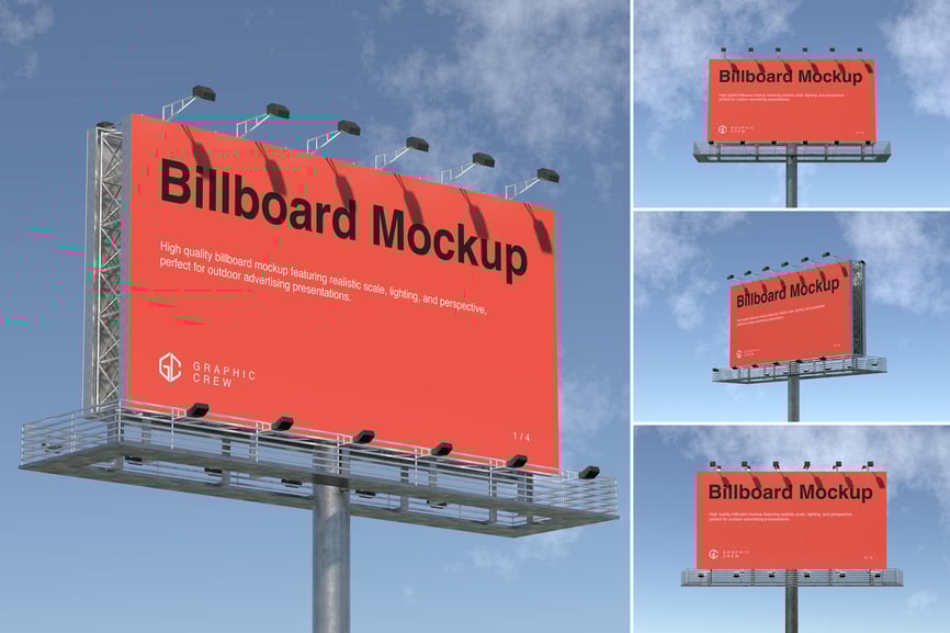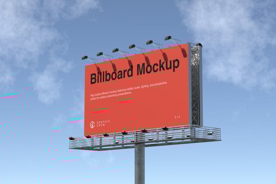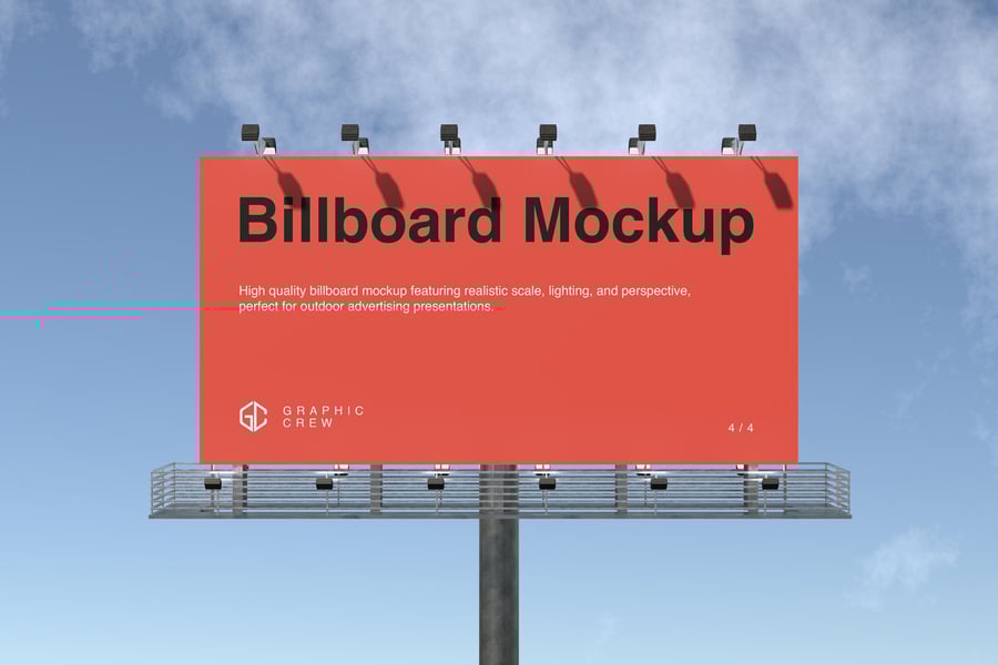 这款广告牌模型旨在呈现大胆、逼真且极具冲击力的视觉效果,助您完美展示户外广告设计。模型采用大比例、精准透视和自然光照,以清晰醒目的细节突出您的广告牌作品。高分辨率和智能对象图层让您能够快速精准地进行自定义。