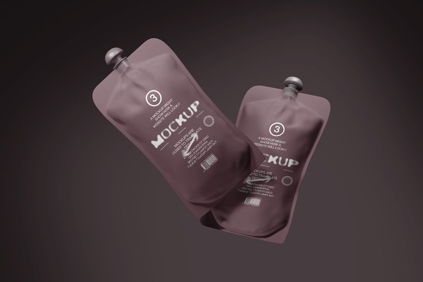此模型展示了两种带吸嘴的包装袋,用于展示液体或补充装产品的设计。它适用于食品、饮料、化妆品或家居用品的包装概念。