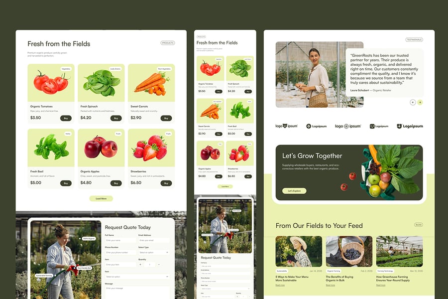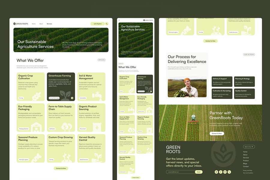 从温室亮点、服务详情到客户评价、价格和联系表格,每个页面都经过精心设计,旨在传递信任、透明和品质。无论您专注于温室种植、有机作物还是批发供应,GreenRoots 都能帮助您清晰地阐述农产品的种植方式、服务对象以及种植方法的重要性。