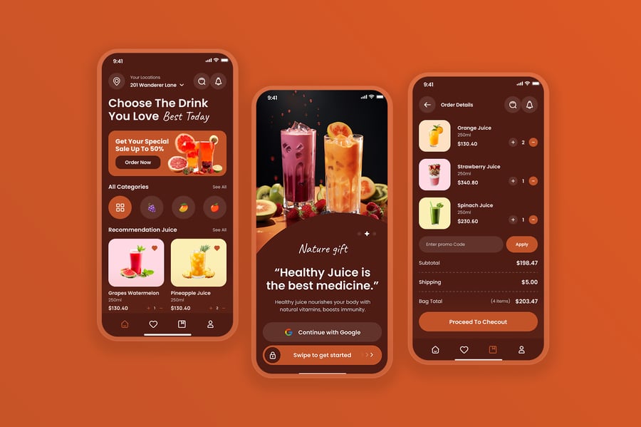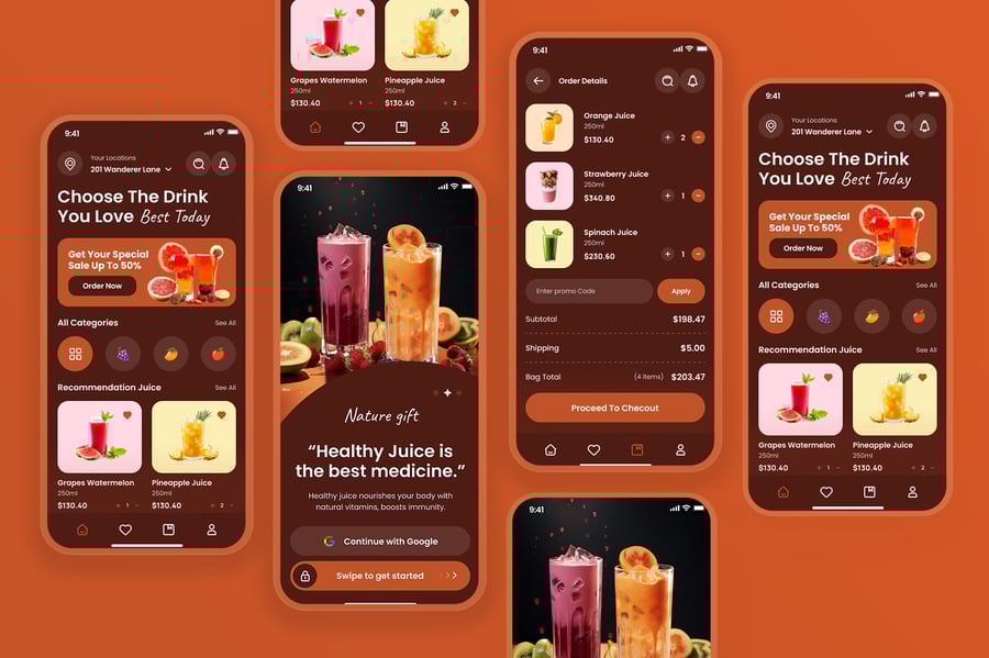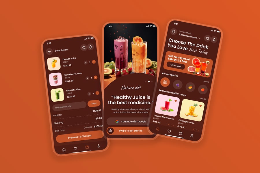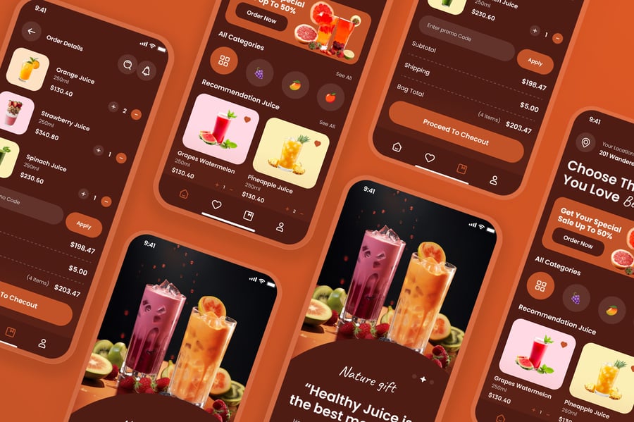 隆重推出健康果汁移动应用 UI 套件,其设计风格清新、活力四射且现代时尚,专为健康生活方式和饮品订购体验量身打造。该 UI 套件使设计师能够以简洁直观的移动布局呈现果汁菜单、营养信息、配料详情、定制选项、订购流程、配送追踪和用户个人资料等功能。