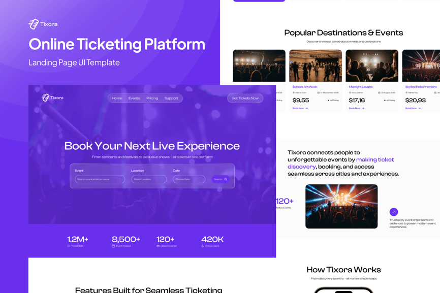 这款现代化的在线票务平台首页用户界面设计以充满活力的紫色为主色调,展示了活动发现、预订界面、价格表和用户统计数据。该设计采用 FIG 格式,简洁明了,非常适合音乐会、节日和现场娱乐平台。凭借清晰的导航、引人注目的首页横幅和结构化的数据呈现,此模板也适用于专注于在线票务销售和活动推广的初创公司、SaaS 产品和数字市场。