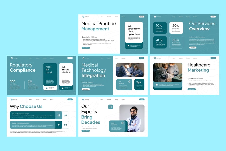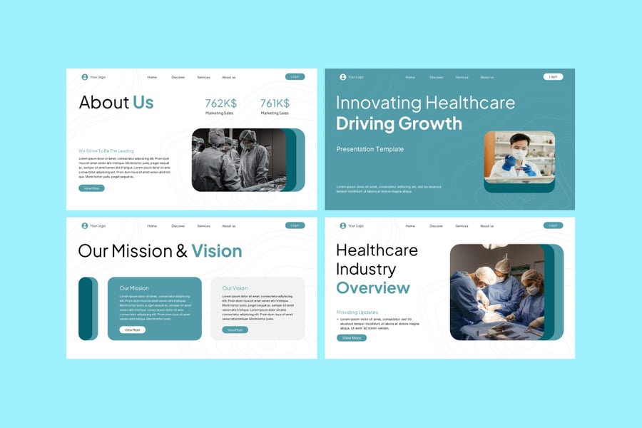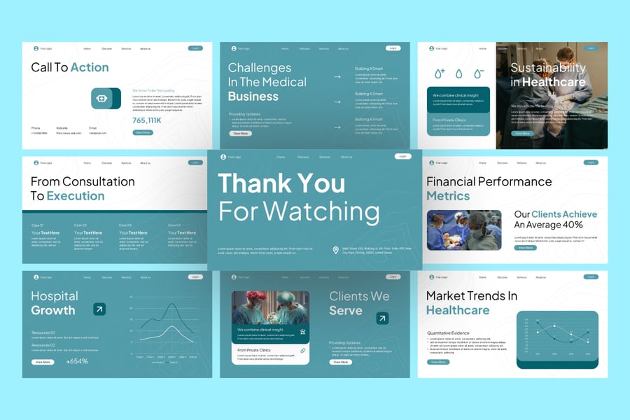 使用这款医疗商务 PowerPoint 演示模板,清晰专业地展示您的医疗保健理念、方案和报告。该模板设计简洁现代,专为医院、诊所、医疗保健初创公司、制药公司和医疗服务提供商量身打造。模板包含独特的幻灯片布局,适用于医疗商业计划、患者护理报告、研究报告、治疗信息图、服务概述和医疗保健营销策略。凭借专业的配色方案、医疗主题图标和数据驱动的图表,它能帮助您有效地向患者、利益相关者或医疗专业人员传达关键信息。