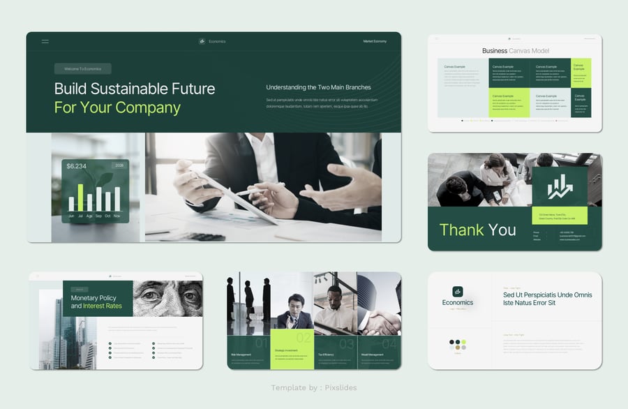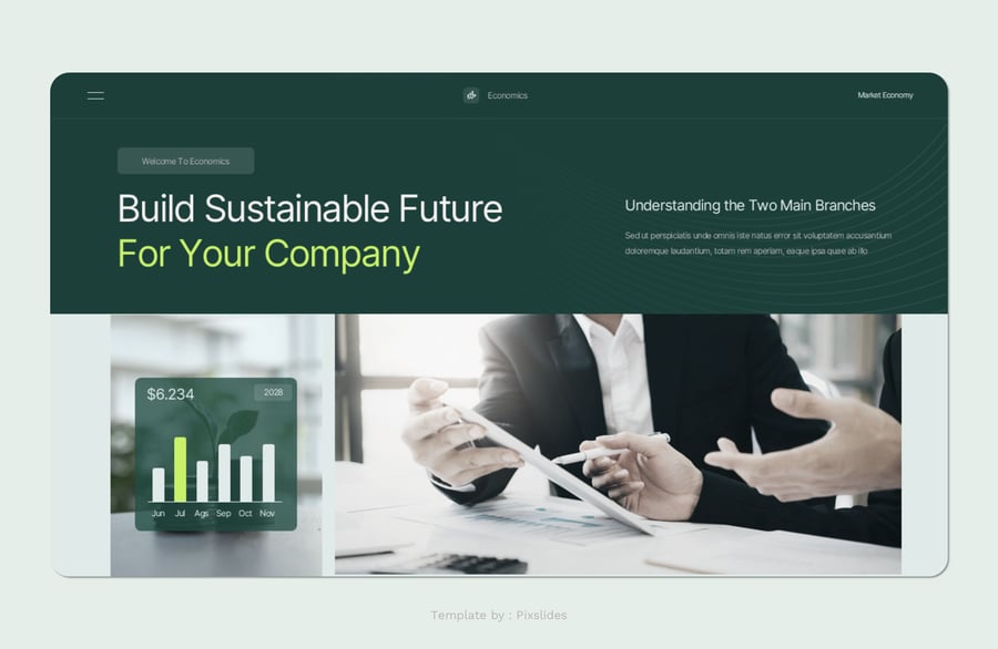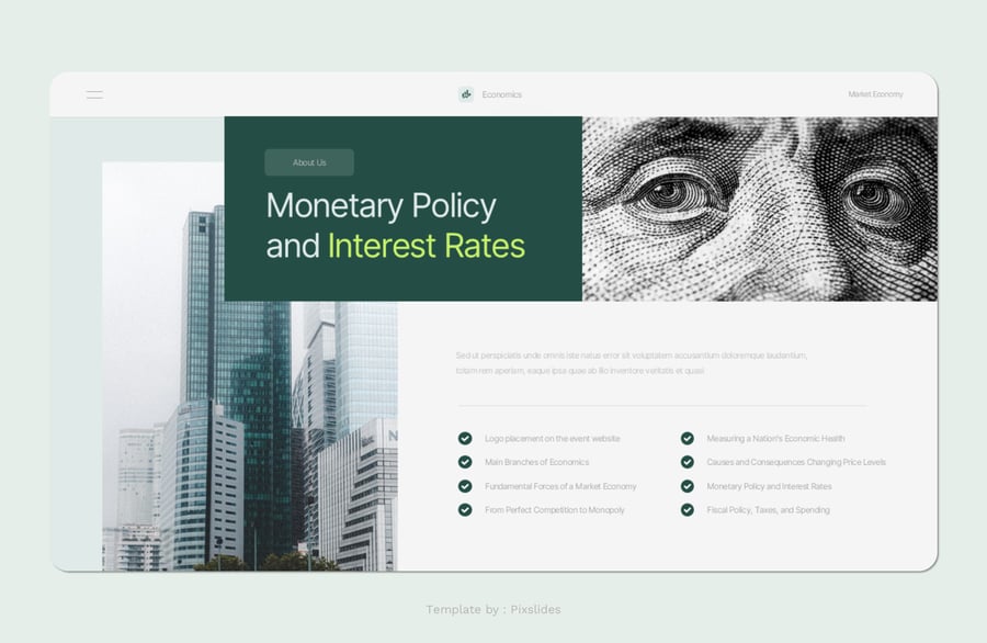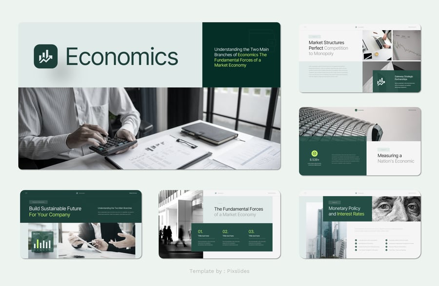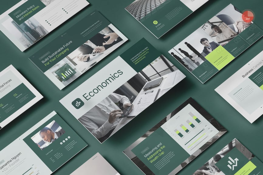 经济学——经济学主题演示文稿模板。每张幻灯片都独具特色,而非重复的布局。只需使用 PowerPoint,即可为您的品牌创建精美的演示文稿,非常适合用作数字媒体资料包、营销资料包或演示文稿。