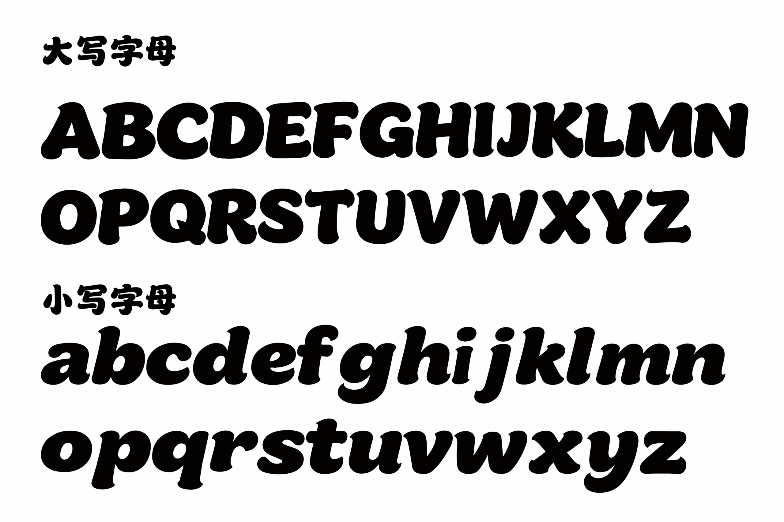 图2的完整字母表(大写A-Z,小写a-z)表明,圆润风格是贯穿整个西文字符集的系统设计。所有字母的笔画粗细、曲率与视觉重量保持了惊人的一致性。大写字母稳固,小写字母灵动,共同形成了一套内在协调、风格极致统一的几何化字符系统。这种系统性设计确保了在拼写英文单词时的视觉和谐,拓展了应用场景。