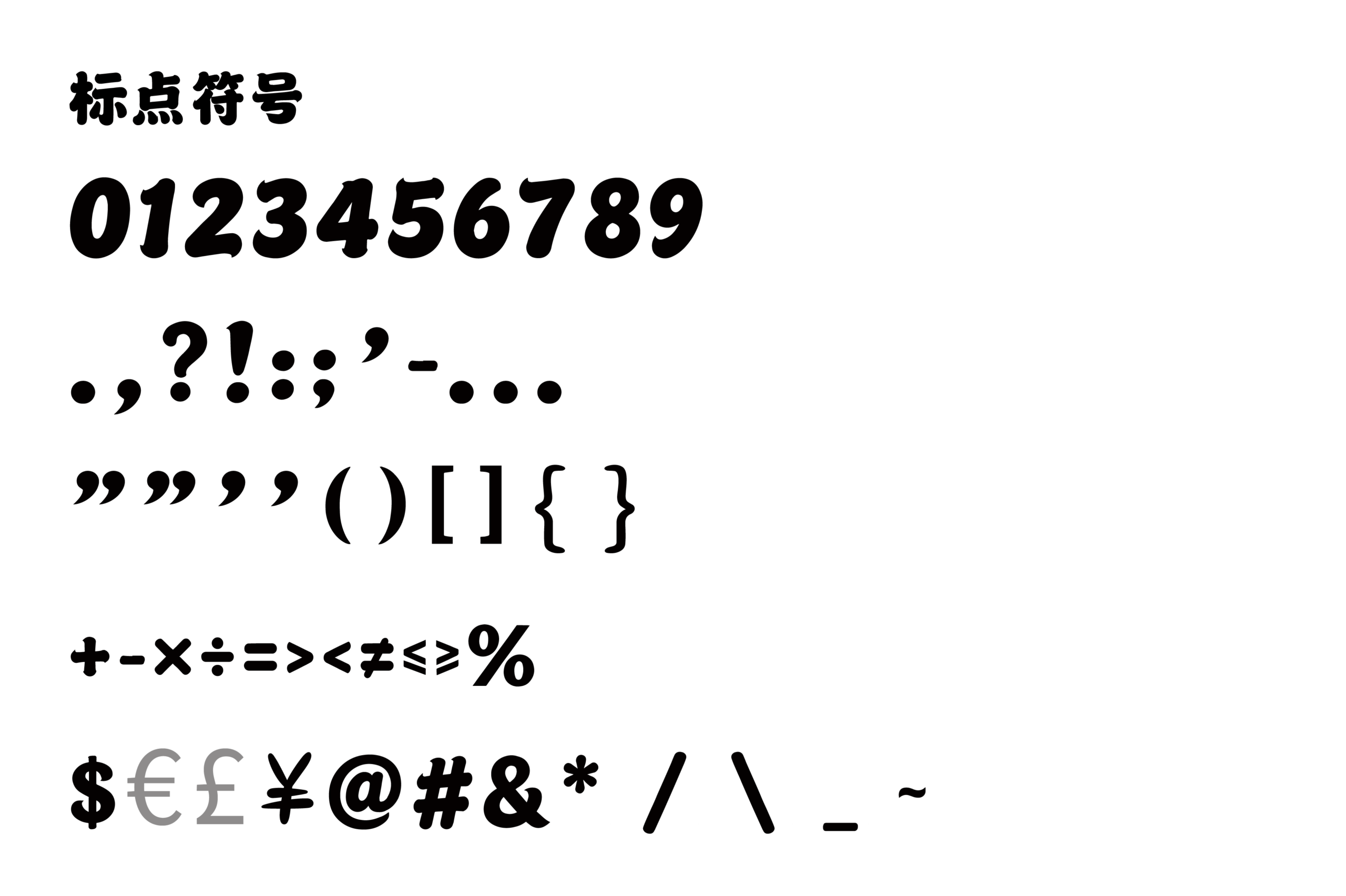 图3所展示的符号集,数字、全套中英文标点、括号、数学运算符、符号等,乐米波波体所有符号都一丝不苟地继承了与字母相同的圆润几何风格。这意味着在进行包含数据、公式、价格等多类信息的UI界面、儿童内容或营销物料设计时,设计师能使用该字体确保从文字到符号的视觉语言绝对统一。