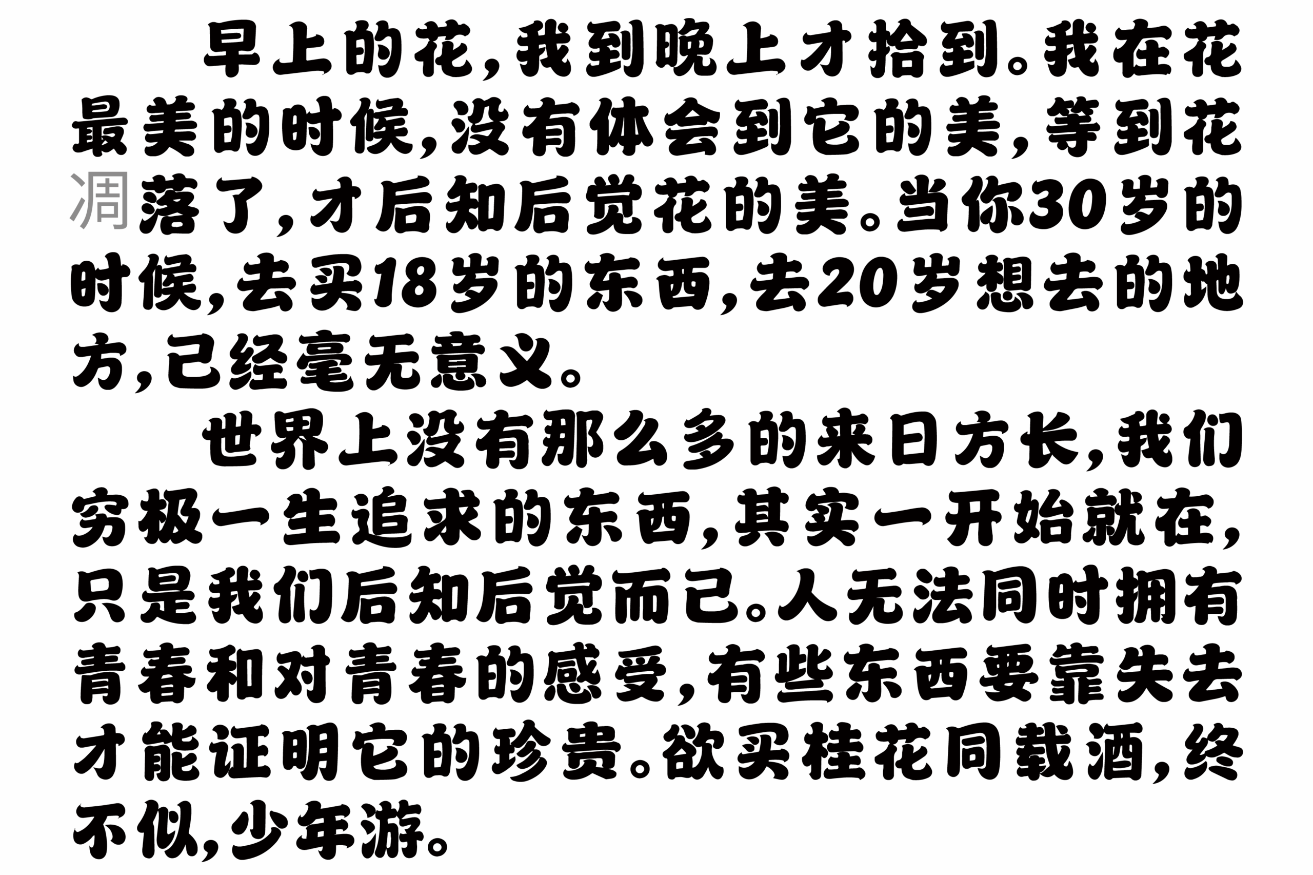 图4的段落排版展示,在这段关于珍惜时光的哲思文字中,字体形成了均匀、平稳、无攻击性的文本灰度。圆润可爱的字形彻底消除了阅读的压迫感,搭配舒适的字间距,为这段感性的内容赋予了真诚、亲切且略带治愈感的叙事氛围,在清晰传达信息的同时增强了情感共鸣。这证明它非常适合用于儿童读物、社交媒体文案、短篇引文、轻松向品牌传播等需要营造温暖、友好氛围的文本场景。